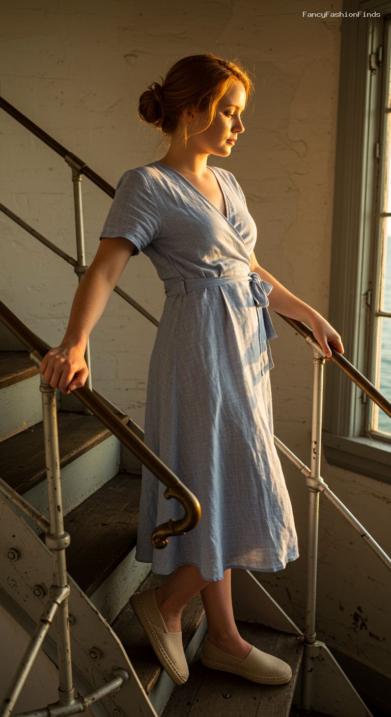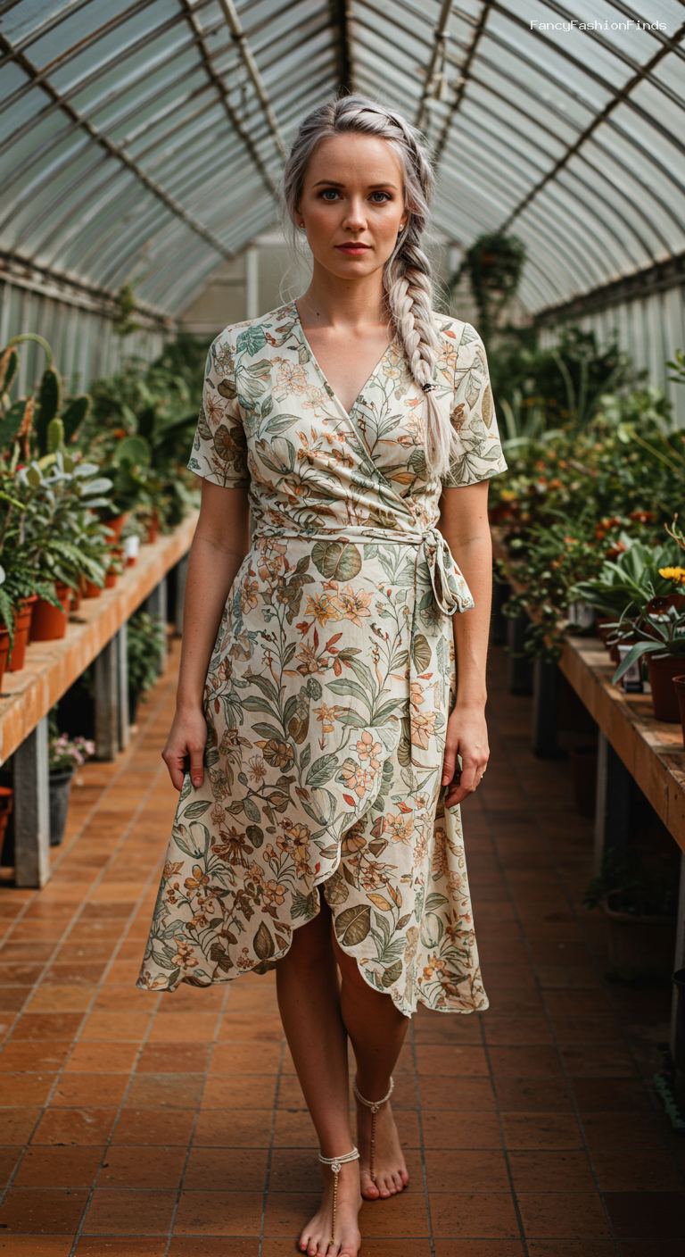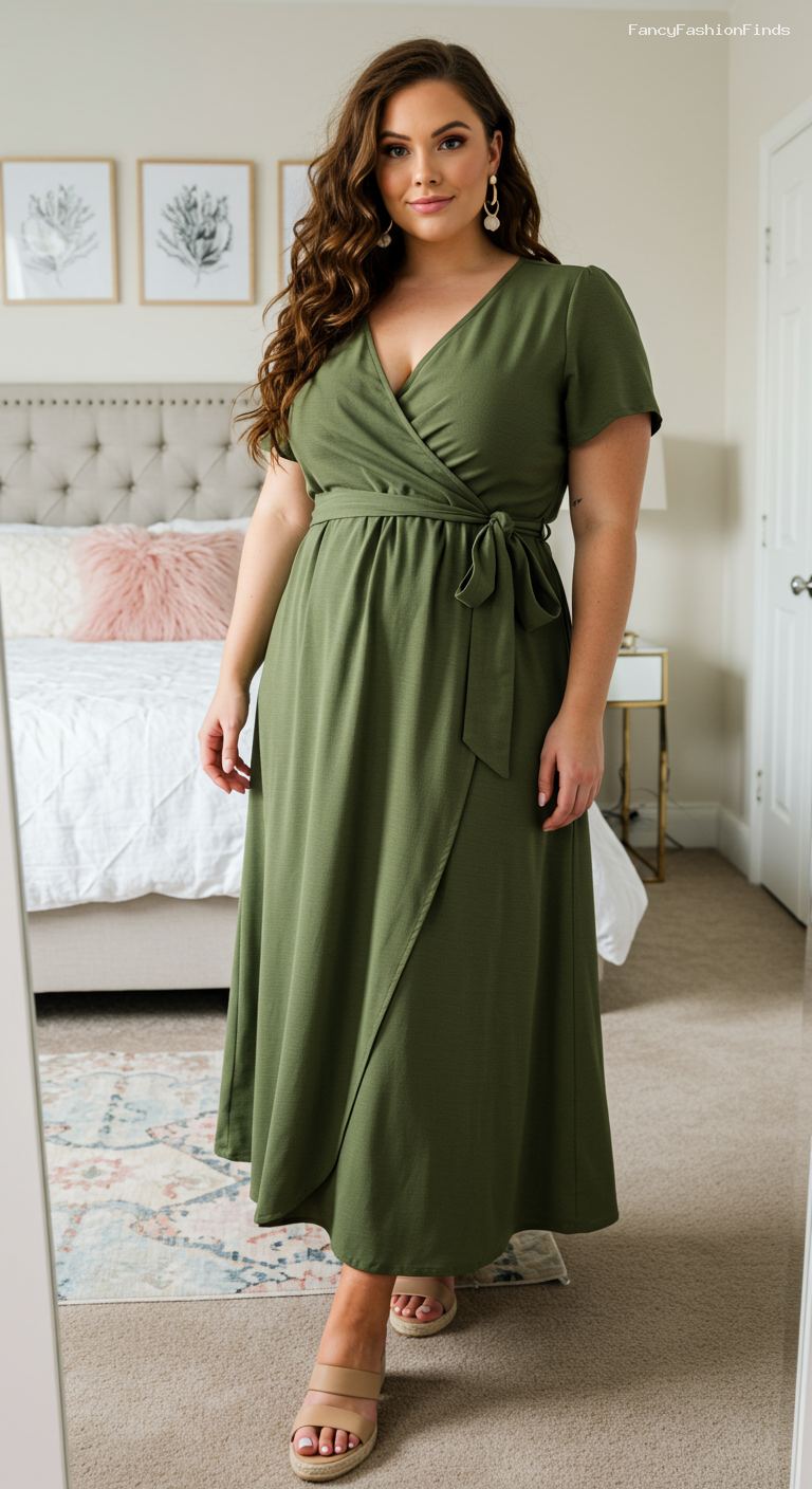 Inspired by the effortlessly chic silhouettes of the 70s, this olive green midi wrap dress offers both comfort and sophisticated style. The flattering V-neckline and adjustable waist tie create a defined shape, complementing various body types, particularly hourglass or pear figures. Its soft, flowing fabric ensures ease of movement, making it ideal for transitional weather. Pair this versatile piece with espadrille wedges for a relaxed yet polished daytime look, perfect for brunches, casual gatherings, or even a relaxed office environment.