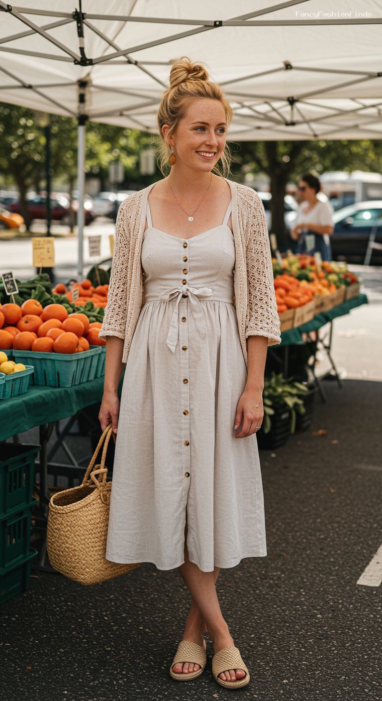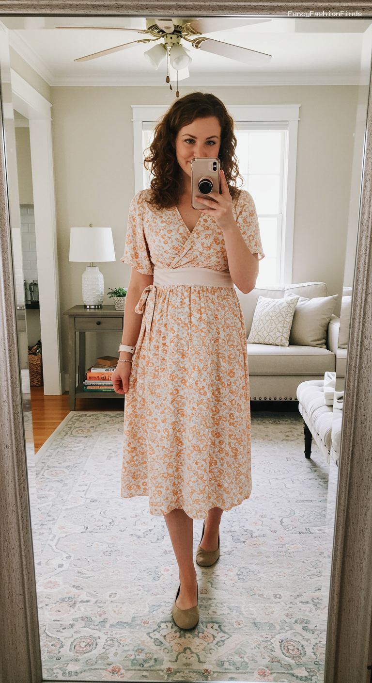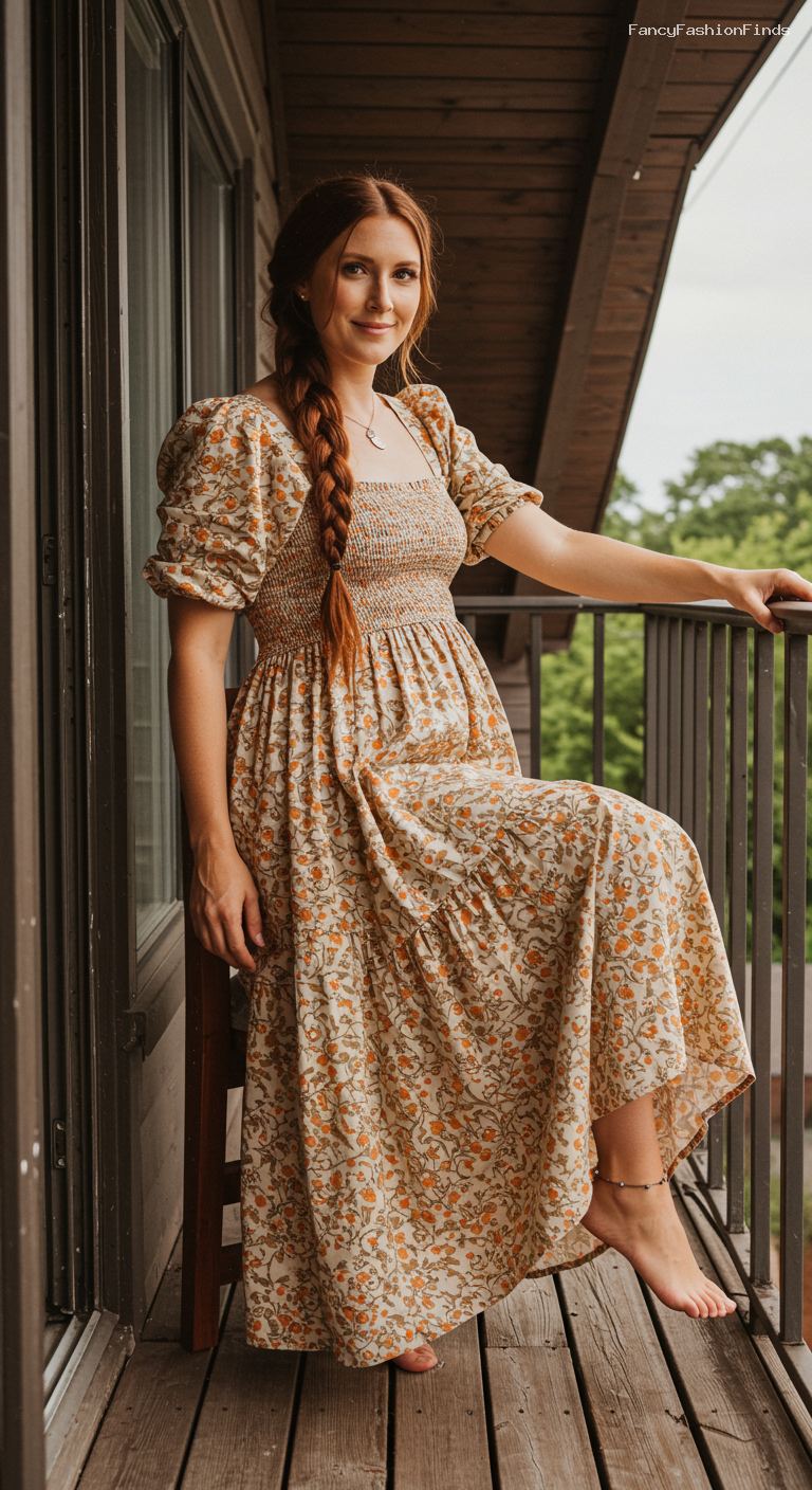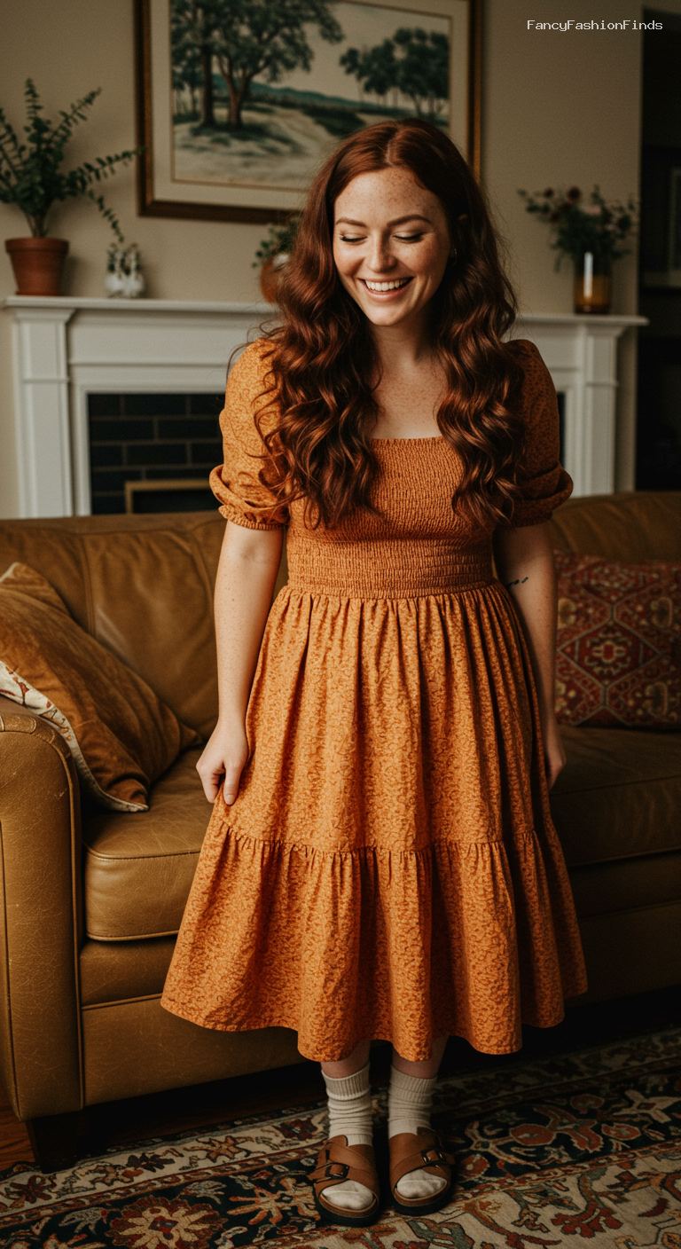 Perfect for crisp autumn days, this outfit offers a delightful blend of comfort and rustic elegance. The burnt orange midi dress, featuring a smocked bodice, square neckline, and tiered skirt, creates a flattering silhouette ideal for various body types, particularly pear or hourglass figures. Its subtle floral print and puff sleeves evoke a charming, vintage-inspired aesthetic. Paired with cream socks and simple brown sandals, this ensemble is perfect for a casual outing, a weekend brunch, or exploring a local market, embodying a relaxed yet thoughtfully styled look.