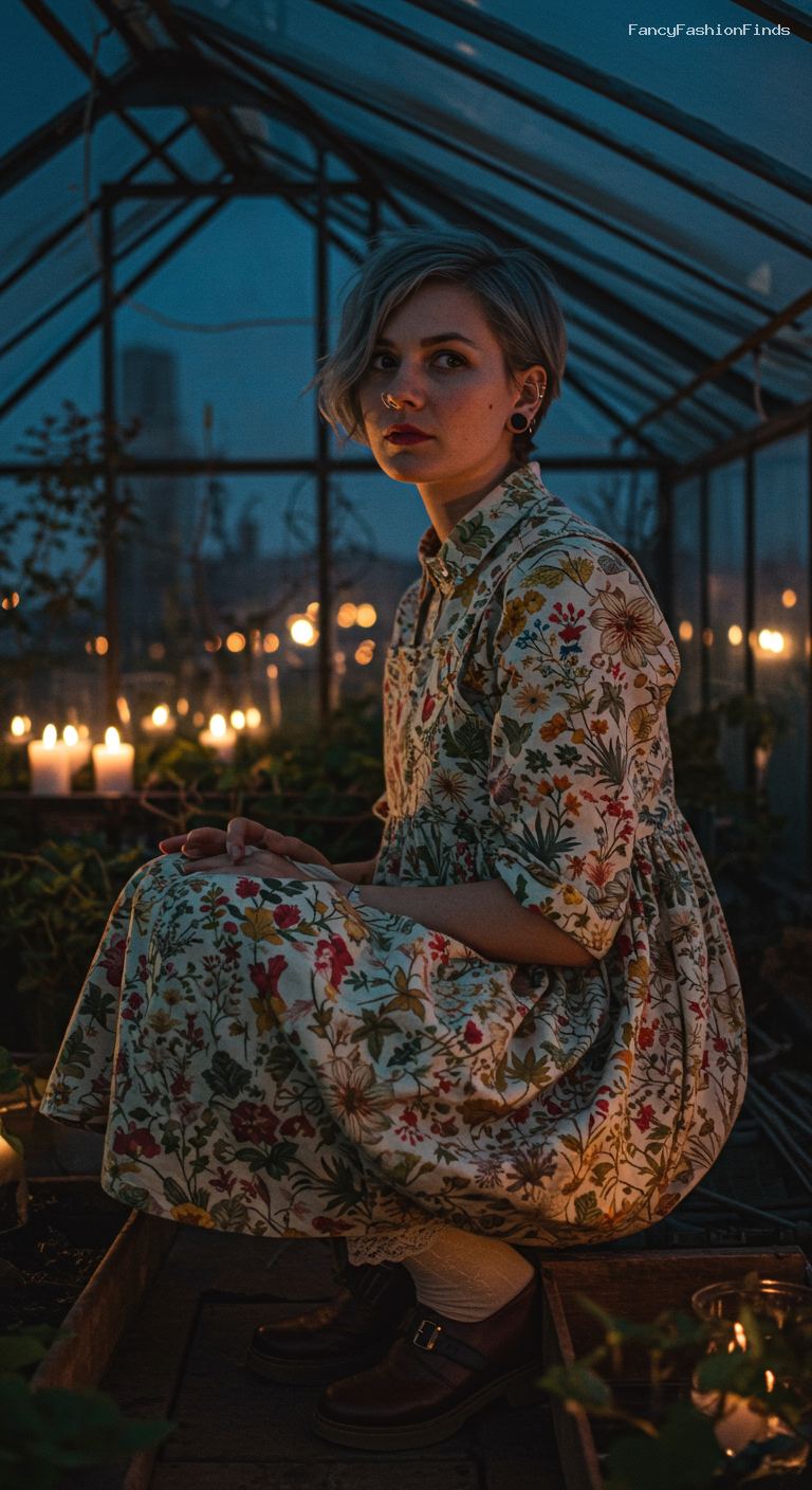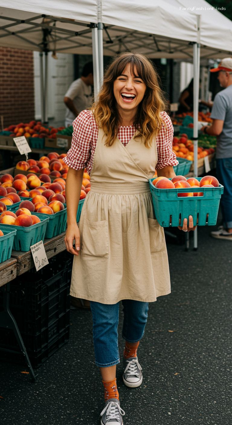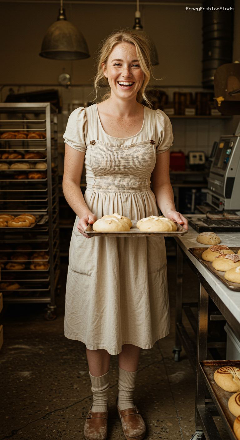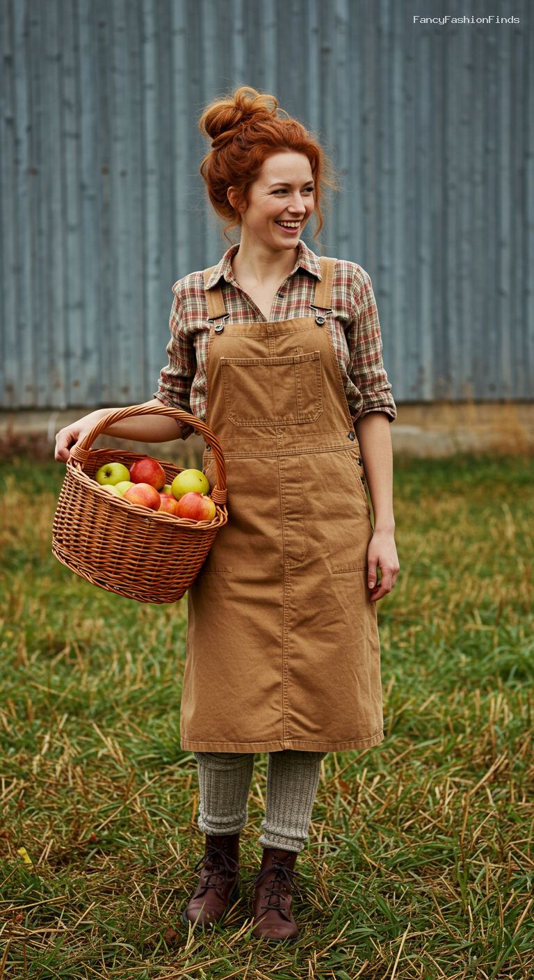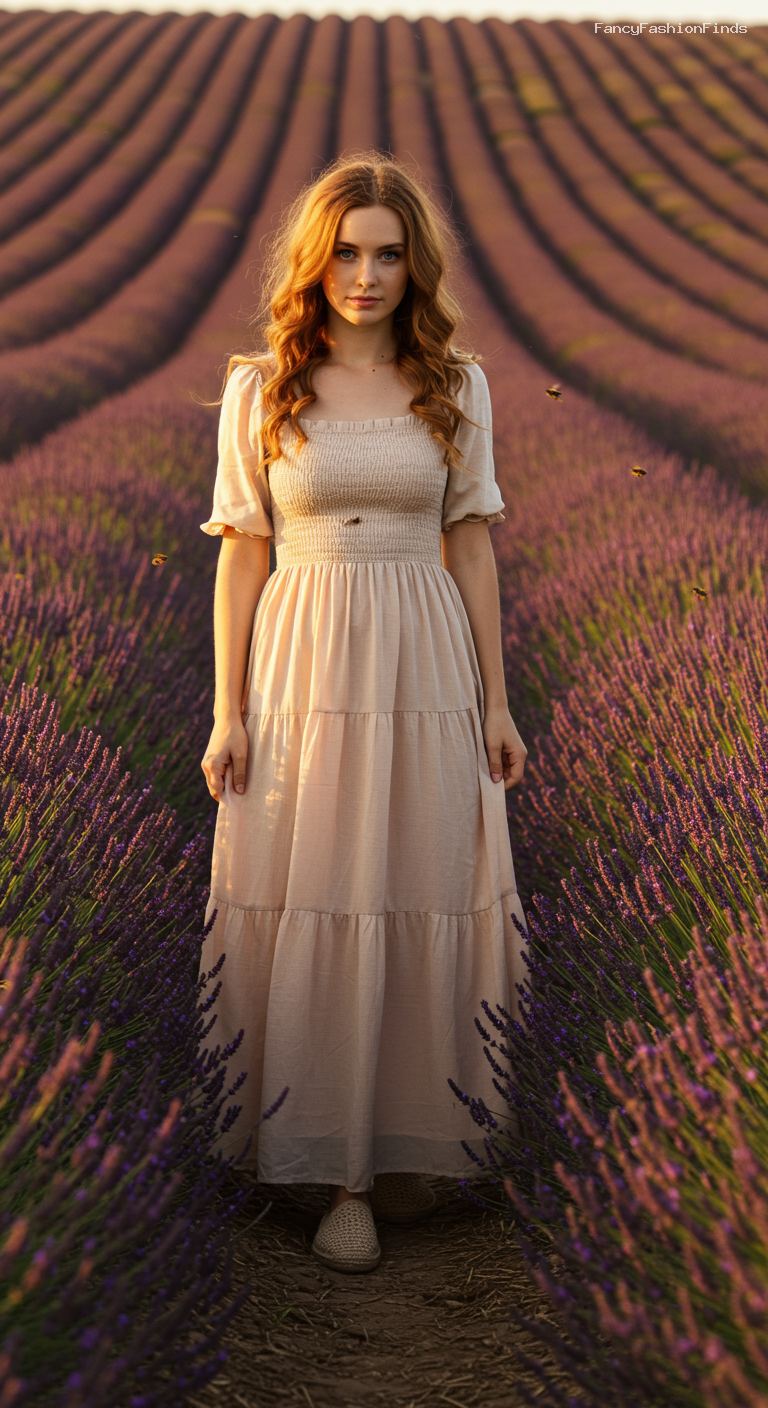 Perfect for crisp autumn days, this outfit offers a delightful blend of comfort and rustic elegance. The burnt orange midi dress, featuring a smocked bodice, square neckline, and tiered skirt, creates a flattering silhouette ideal for various body types, particularly pear or hourglass figures. Its subtle floral print and puff sleeves evoke a charming, vintage-inspired aesthetic. Paired with cream socks and simple brown sandals, this ensemble is perfect for a casual outing, a weekend brunch, or exploring a local market, embodying a relaxed yet thoughtfully styled look.