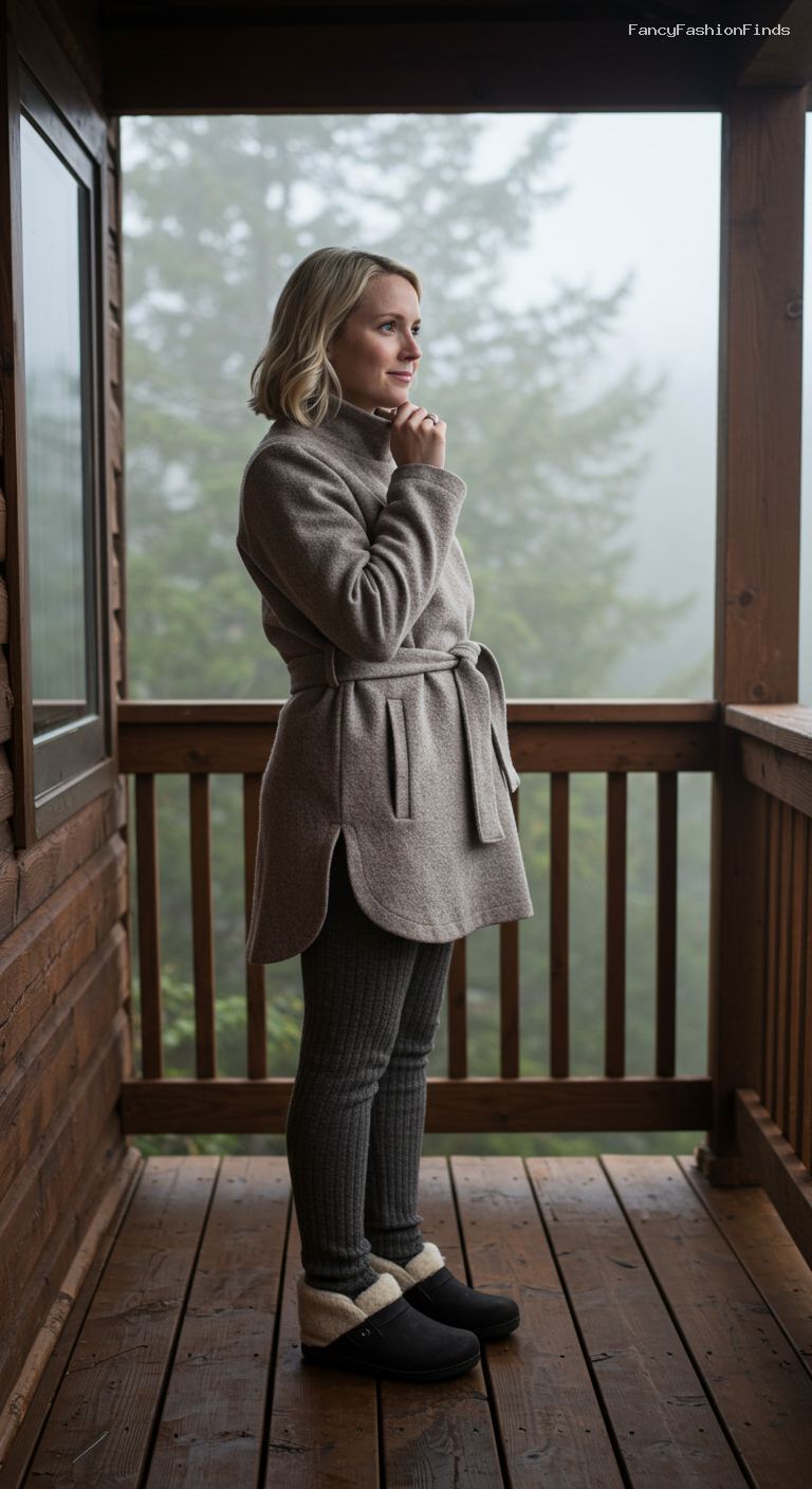 Perfect for a leisurely weekend at home or running casual errands, this outfit prioritizes ultimate comfort without sacrificing a polished, understated style. The soft grey crewneck sweatshirt offers a relaxed fit, beautifully paired with form-fitting dark leggings that create a balanced silhouette. This versatile combination suits various body types, particularly those who appreciate a comfortable yet put-together aesthetic for their daily activities. It’s an ideal choice for women seeking effortless, cozy style that transitions seamlessly from indoor lounging to quick outdoor ventures.