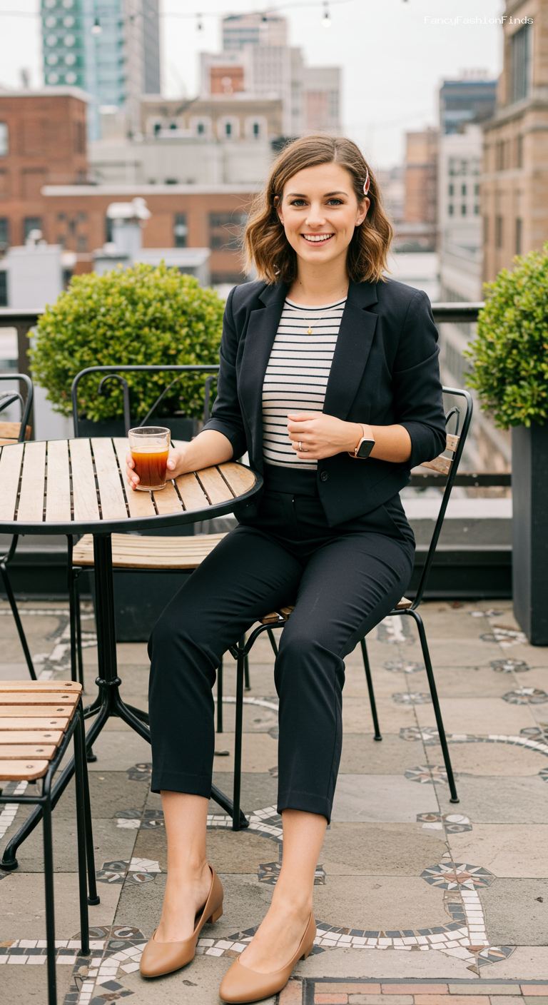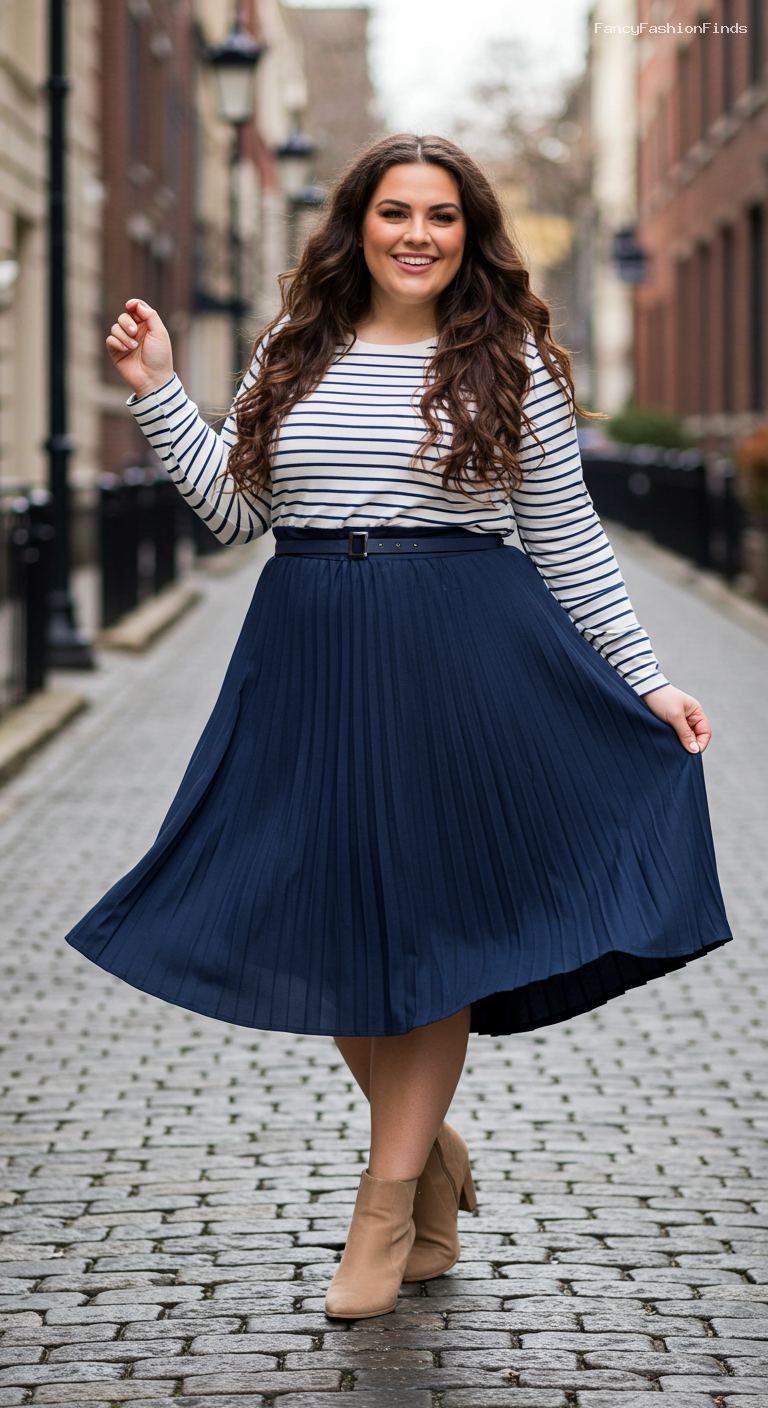 Perfect for cooler transitional weather, this outfit combines classic elements with a relaxed yet polished feel. A long-sleeved striped top, featuring crisp navy and white, pairs effortlessly with a flowing navy pleated midi skirt that offers comfortable movement. The look is cinched with a slim black belt, defining the waist, while neutral-toned ankle boots complete this chic ensemble, suitable for a casual brunch or an afternoon of city exploration.
