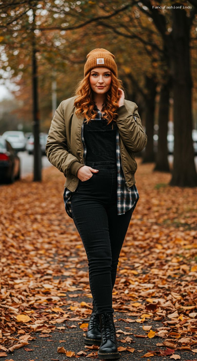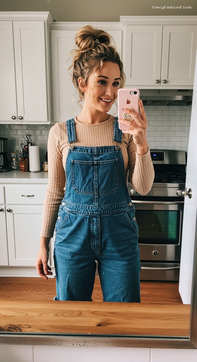 The unique charm of this outfit lies in its effortlessly cool combination of classic denim overalls paired with a fitted, ribbed long-sleeve top. This ensemble offers a relaxed yet stylish aesthetic, perfect for those who appreciate comfort without sacrificing fashion. The neutral top grounds the sturdy denim, creating a balanced and approachable look that flatters various body types. Ideal for casual outings, weekend errands, or a relaxed brunch, this outfit embodies a playful yet refined personal style.