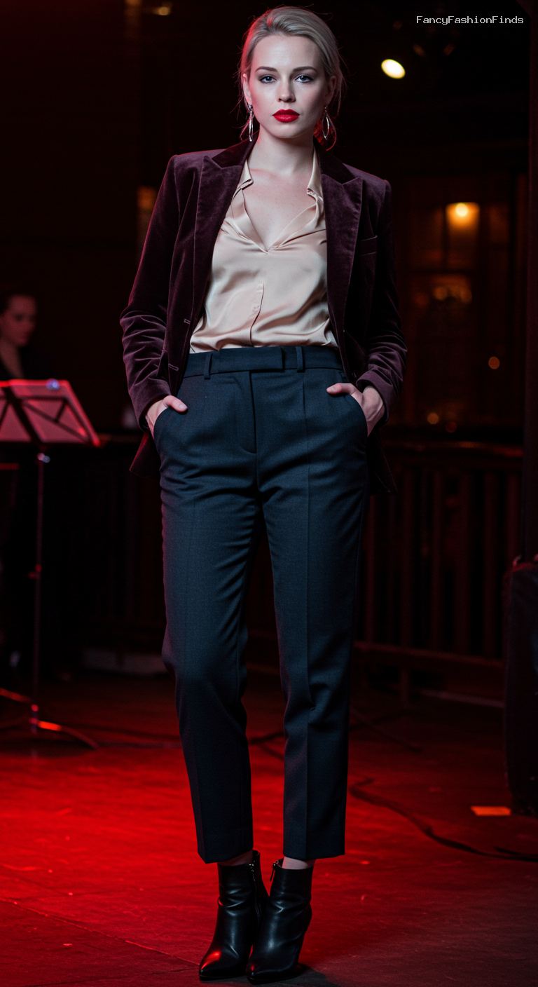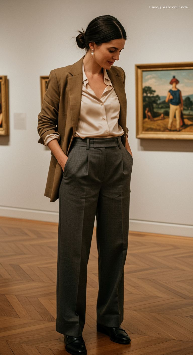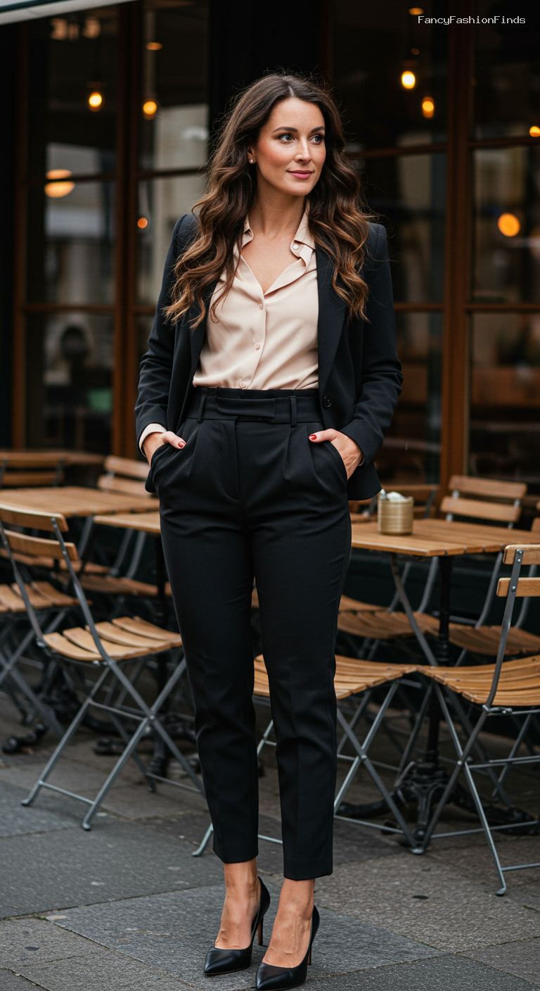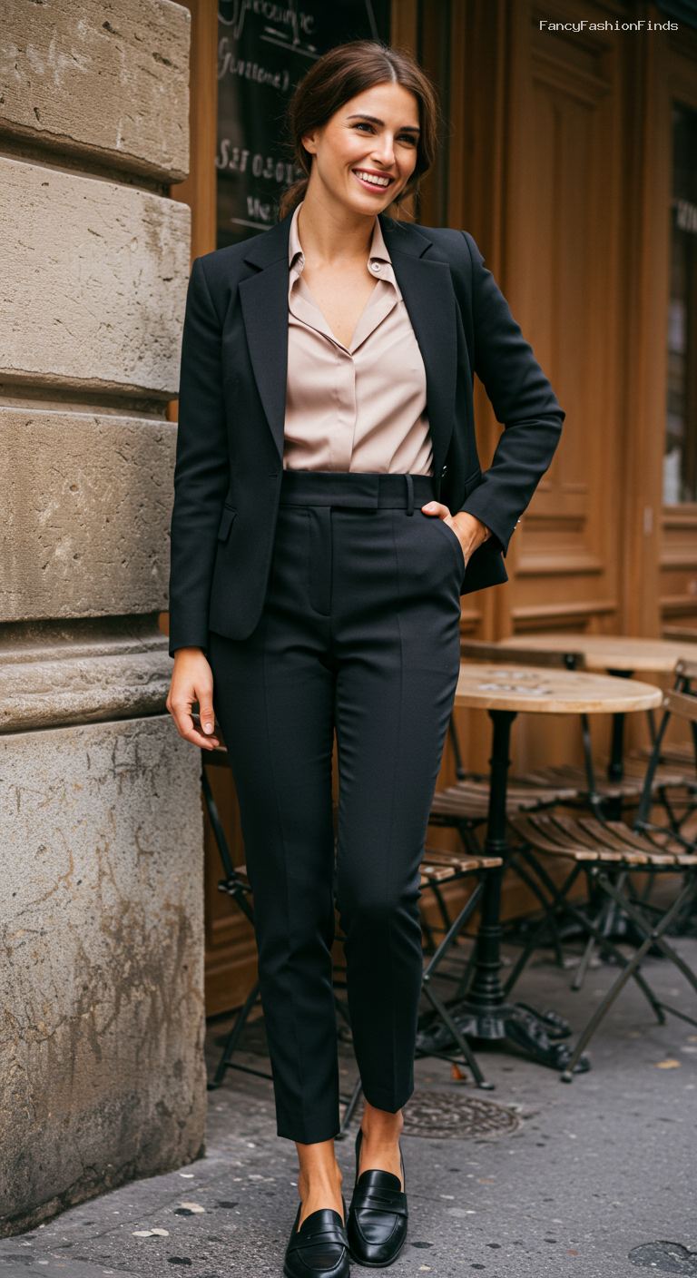 The smooth, luxurious texture of the champagne-hued satin blouse creates a sophisticated contrast against the crisp, tailored lines of the black blazer and trousers. This refined pairing offers a polished aesthetic, perfect for professional environments or upscale casual events. The streamlined silhouette, featuring a well-fitted blazer and ankle-length trousers, would flatter most body types, particularly those seeking a smart, elongated look. Finishing the ensemble with classic black loafers maintains the sophisticated yet comfortable appeal, making it ideal for the modern woman who values both style and practicality.