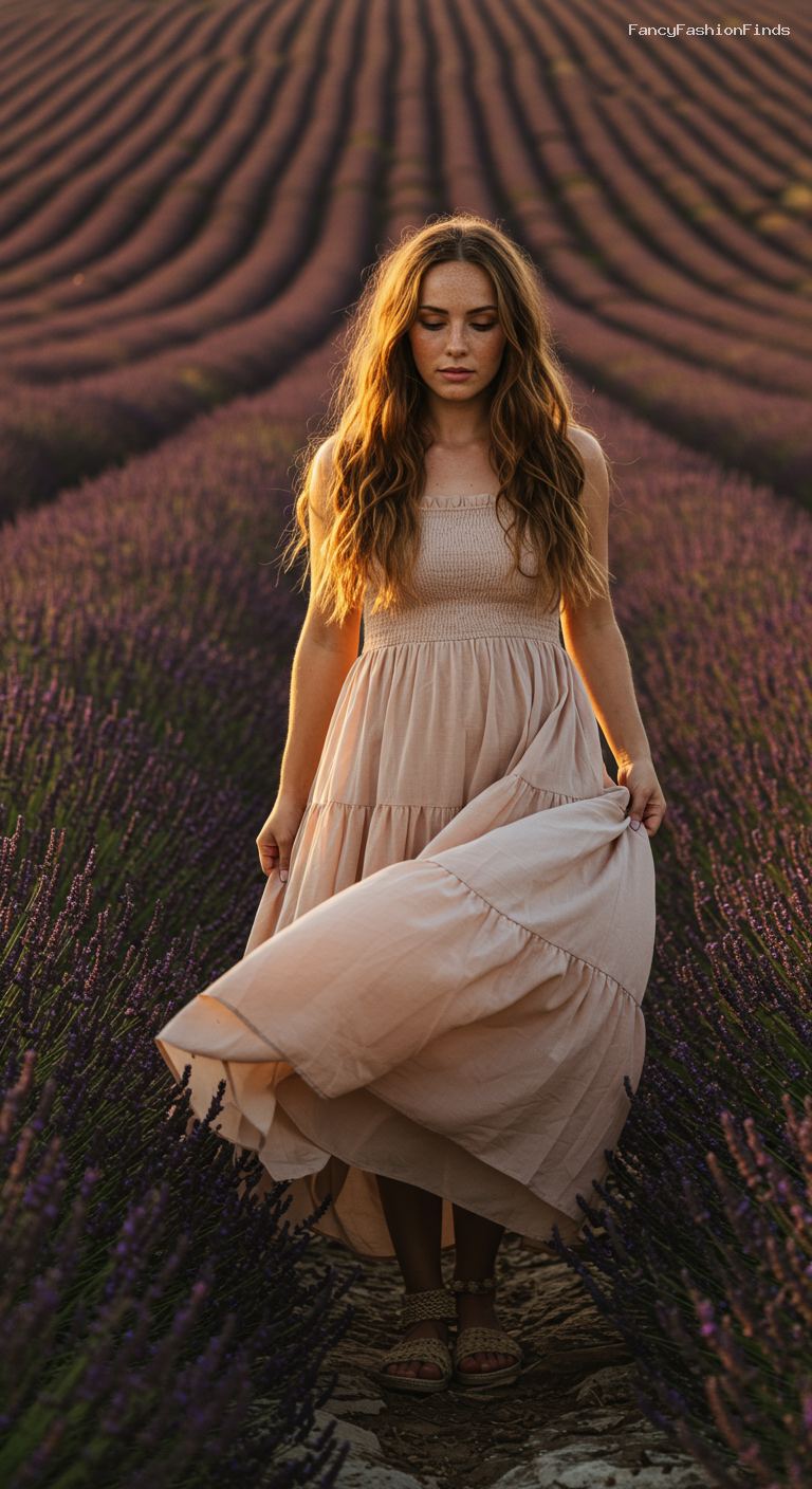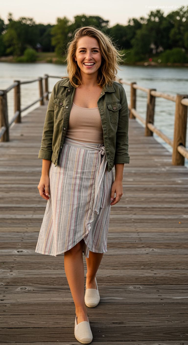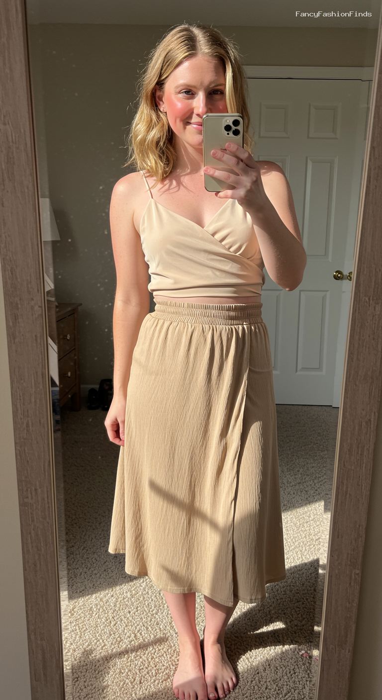 Inspired by a minimalist resort aesthetic, this ensemble offers an effortlessly chic vibe. The soft champagne wrap top with delicate spaghetti straps pairs beautifully with the crinkled midi skirt, featuring a subtle side slit for movement. This monochromatic pairing, with its relaxed fit and breathable fabric, would flatter most body types and is ideal for those who appreciate understated elegance. It’s a perfect choice for warm-weather outings, from brunch with friends to a leisurely vacation evening.