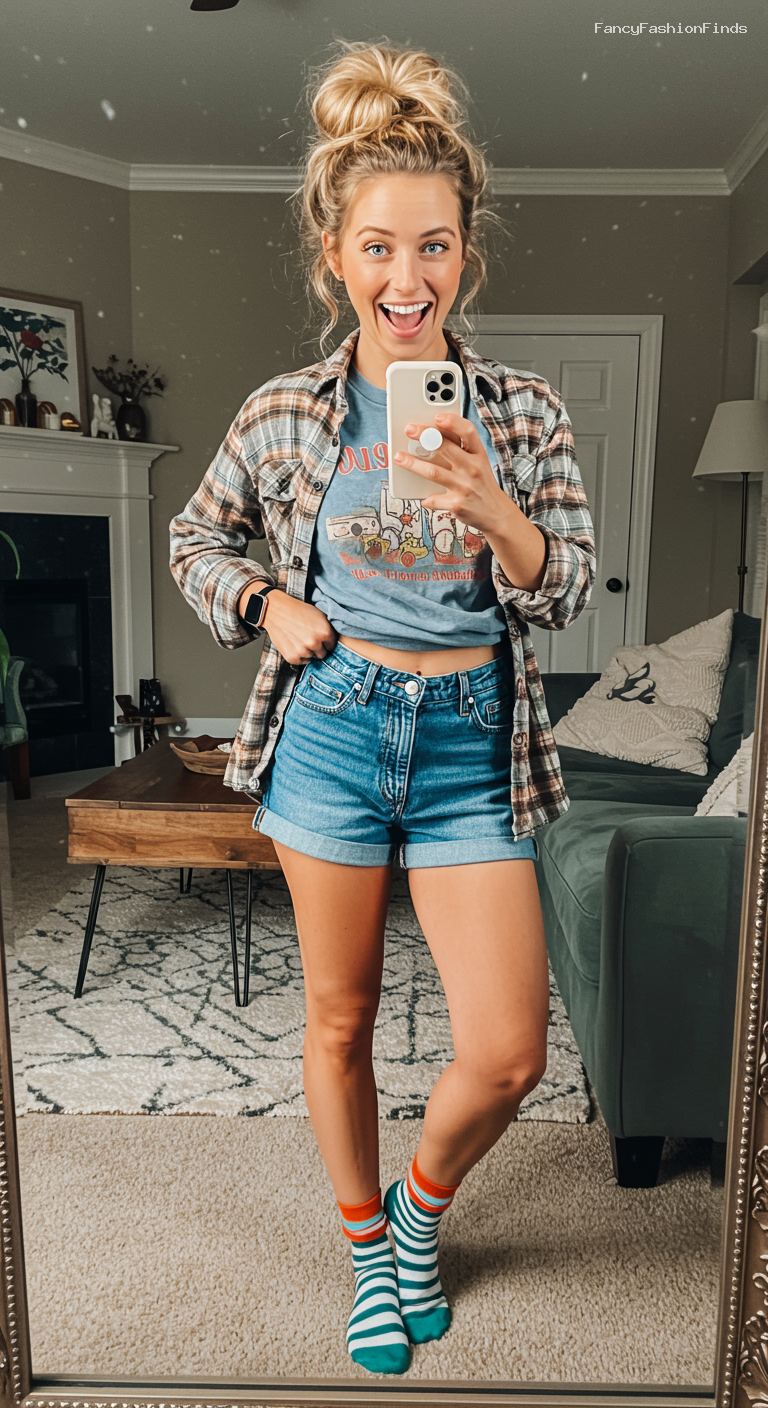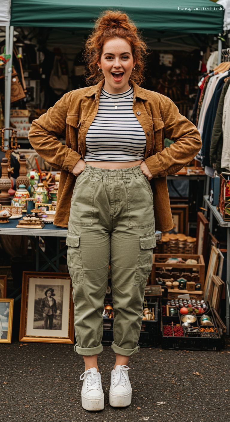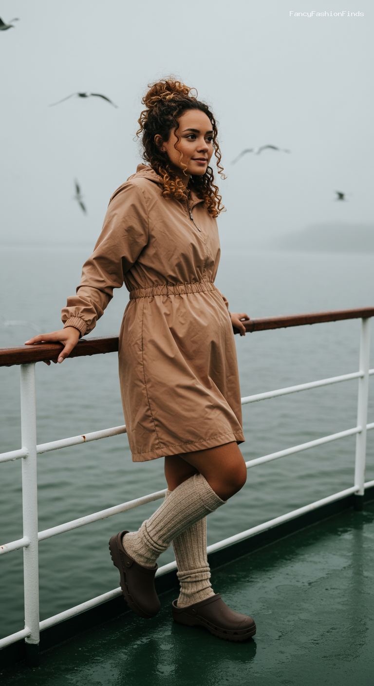 The knee-high ribbed socks, paired with platform sandals, create an unexpected yet charming autumnal foundation for this look. A utility-style shirt dress in a warm, earthy tone with a cinched waist offers a relaxed yet polished silhouette. This ensemble is ideal for those who appreciate comfort blended with a touch of quirky sophistication, suitable for a casual outing or a relaxed weekend brunch. The combination works particularly well on various body types, highlighting the waist while maintaining an effortless, comfortable feel.