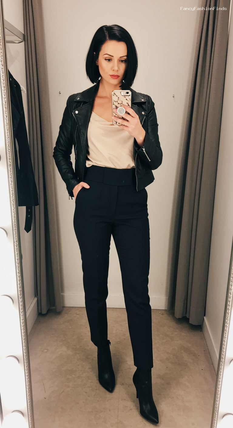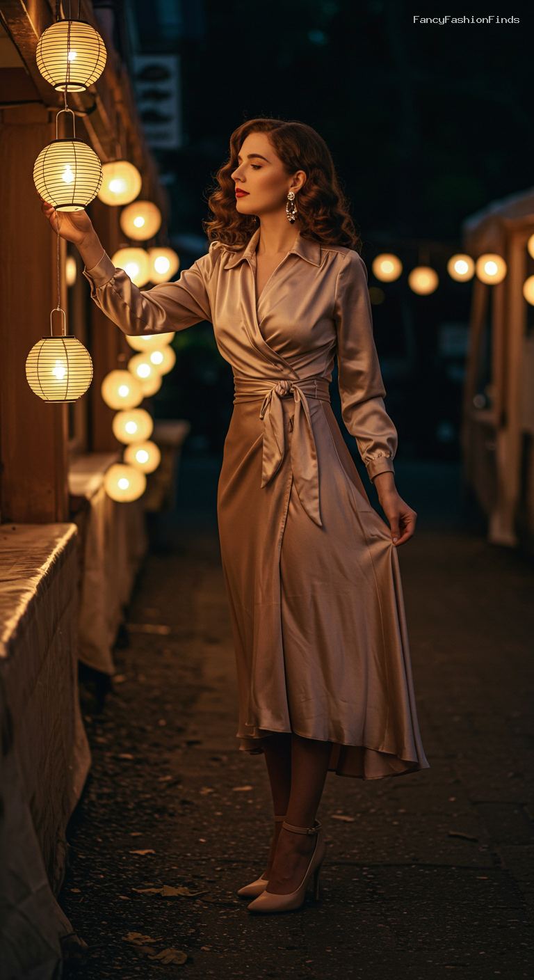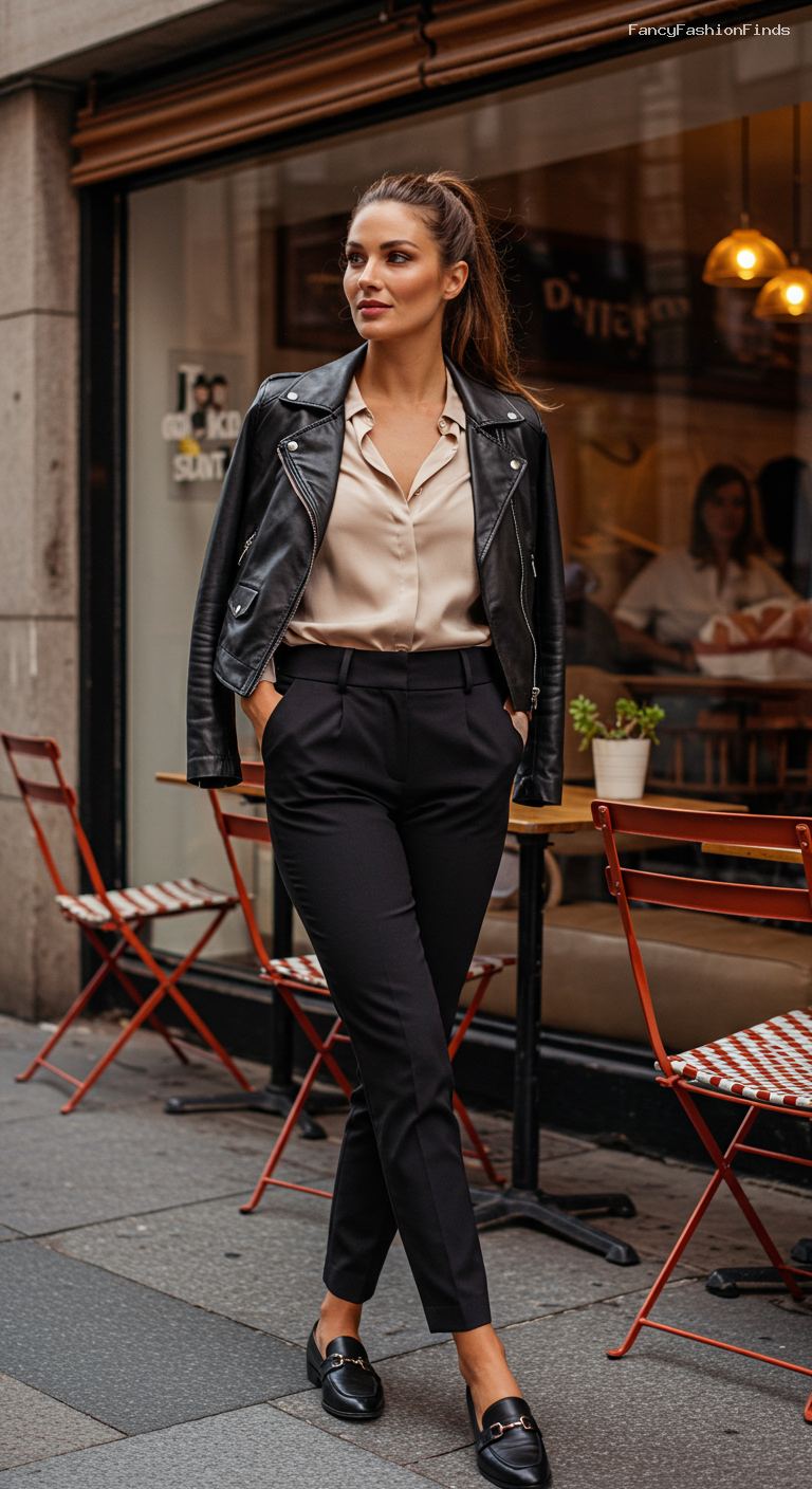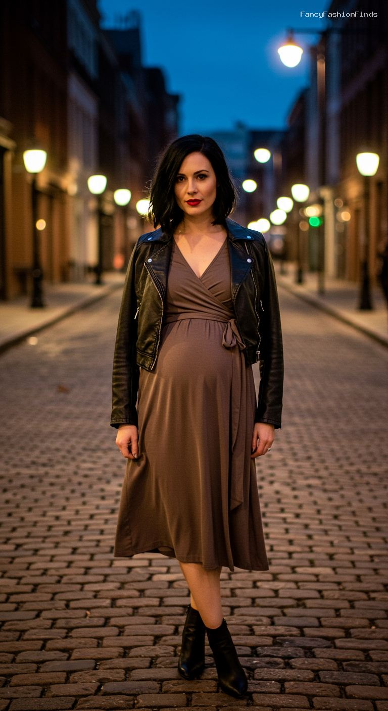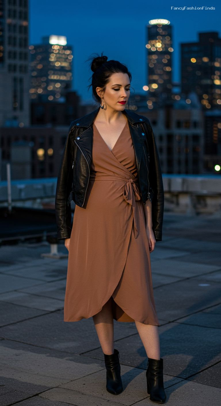 Layering a structured moto jacket over a fluid wrap dress creates a compelling contrast, blending softness with an edgy appeal. The earthy taupe of the dress, with its flattering V-neck and tie-waist detail, harmonizes with the black leather, while ankle boots ground the ensemble with a chic, modern finish. This versatile combination is ideal for various body types, particularly those seeking to define their waistline while adding a touch of contemporary flair. It’s a sophisticated choice for evening outings, casual social events, or even a creative workplace setting.