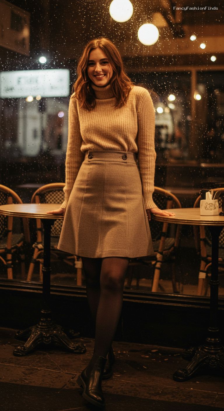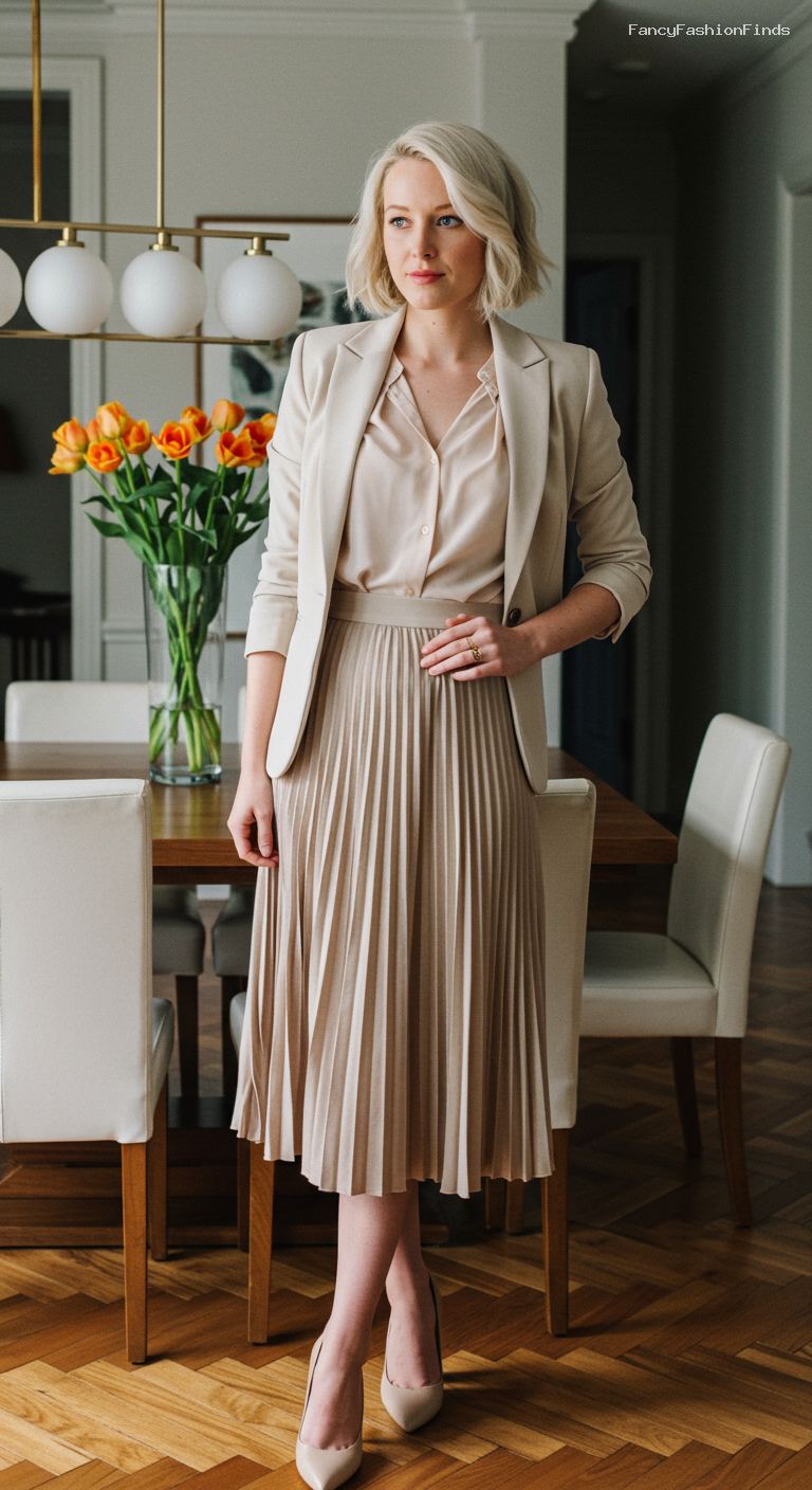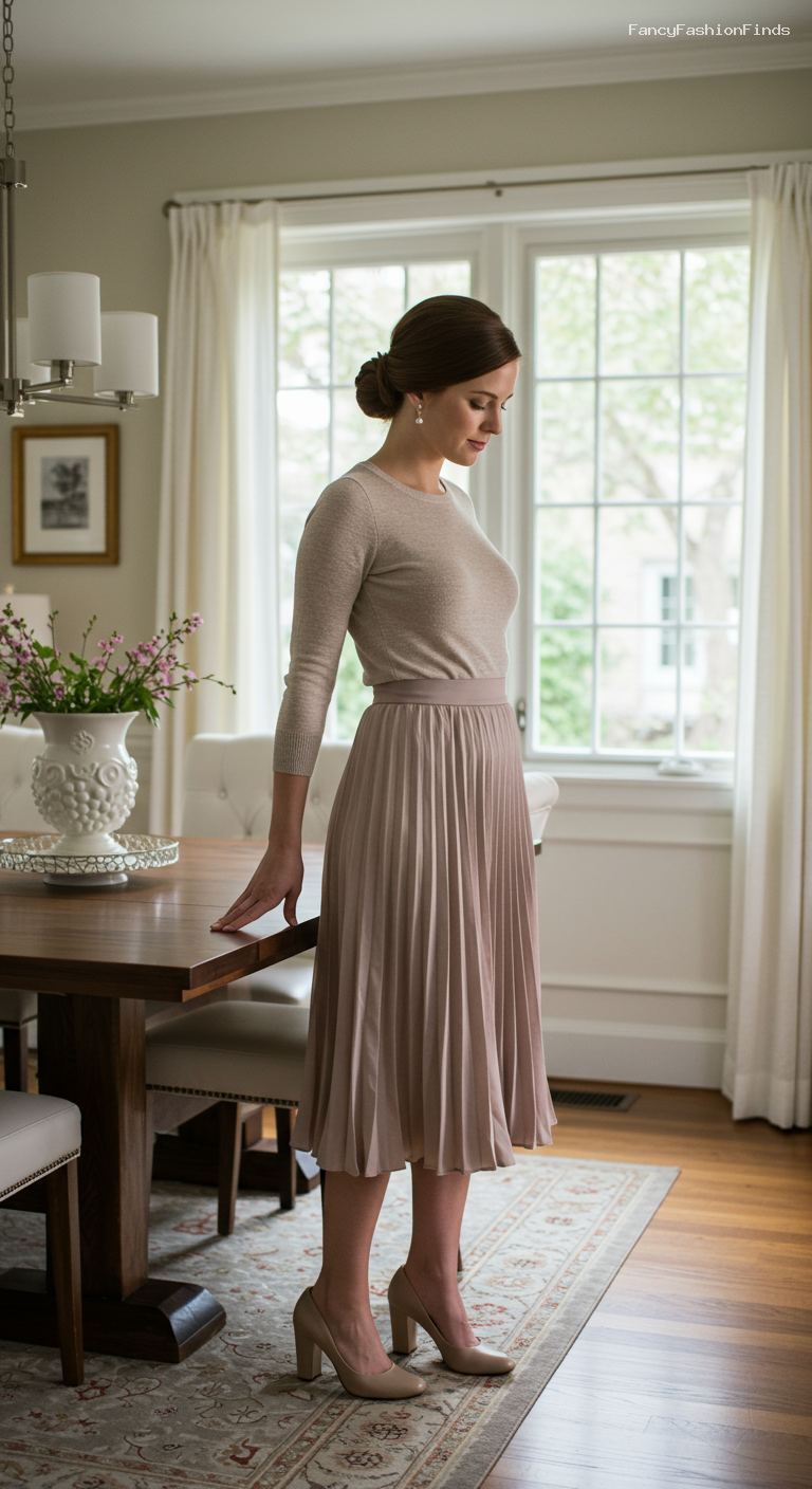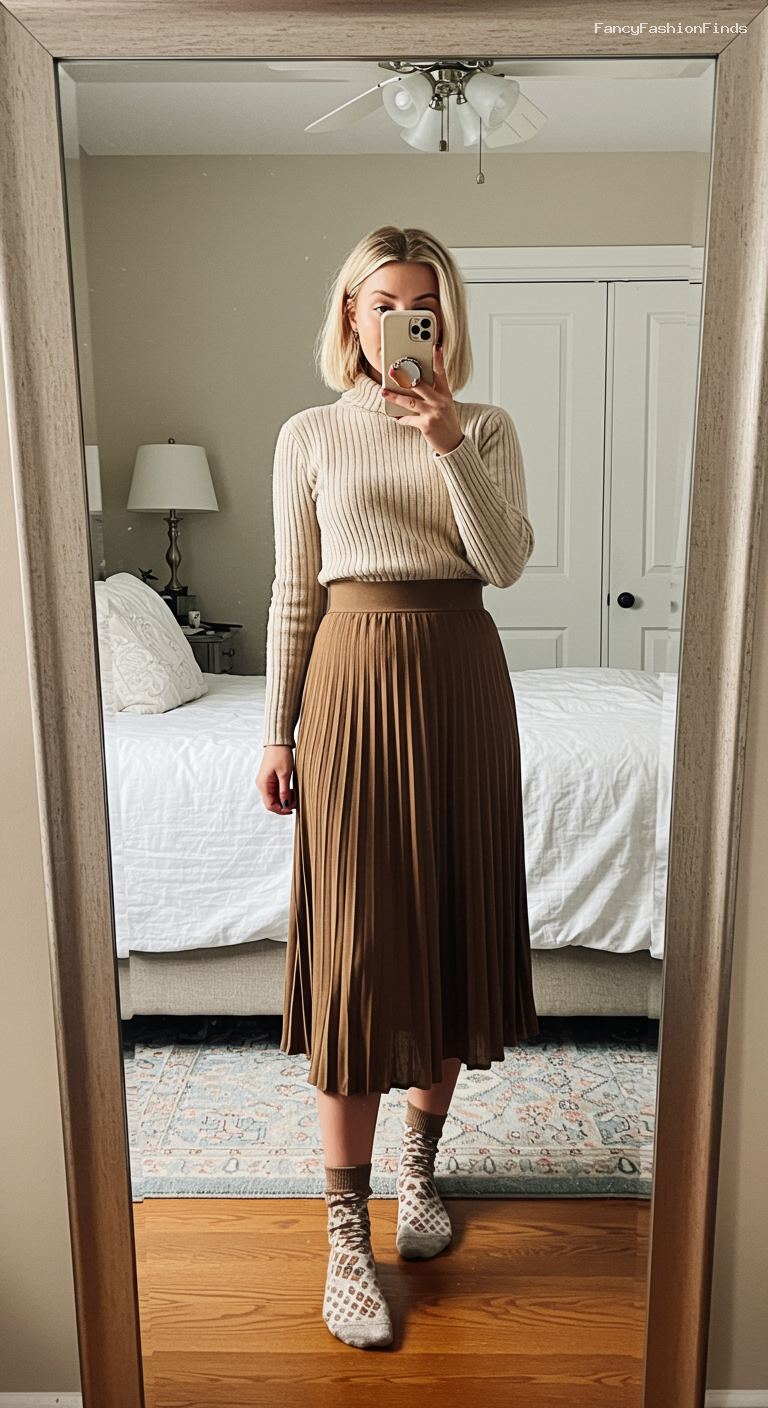 The subtle ribbing of the cream turtleneck sweater offers a textural contrast to the smooth, flowing pleats of the midi skirt, creating a sophisticated and comfortable ensemble. This look, with its harmonious blend of neutral tones, flatters various body types by defining the waist and offering an elegant drape. It’s a versatile choice for a casual office environment, a relaxed brunch, or an afternoon gallery visit. The combination of a fitted top and a voluminous skirt creates a balanced silhouette, perfect for those who appreciate understated elegance.
