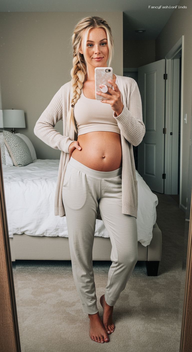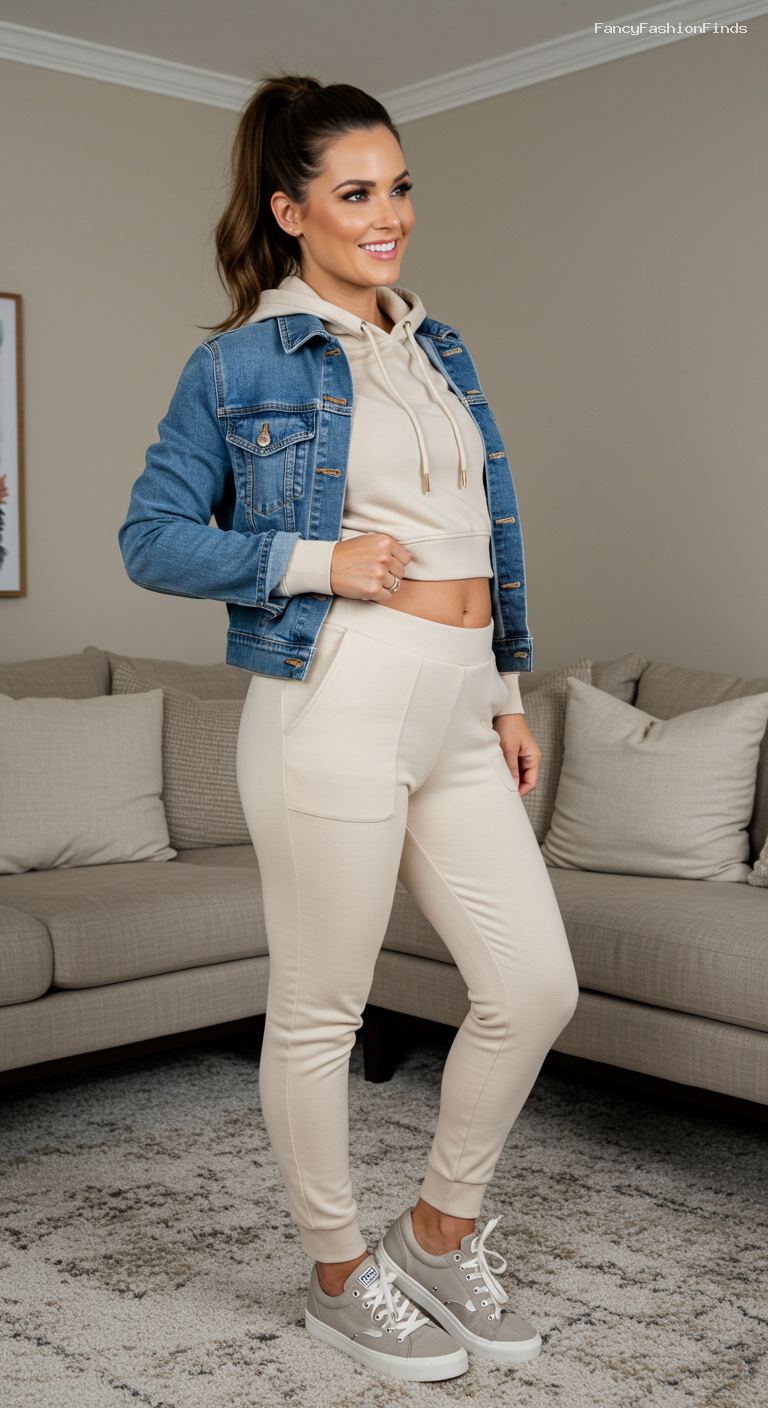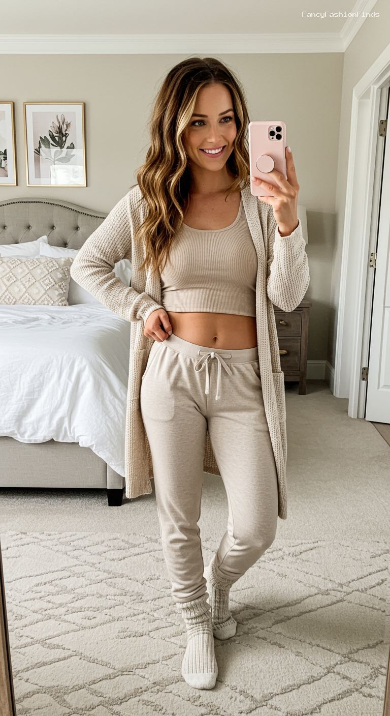 Perfect for cooler transitional weather or a relaxed day indoors, this outfit prioritizes comfort without sacrificing style. The coordinating beige ribbed crop top, longline cardigan, and light grey joggers create a cohesive, soothing aesthetic. This versatile ensemble is ideal for those who favor a minimalist, comfortable personal style and can be worn for lounging at home, running errands, or casual appointments.