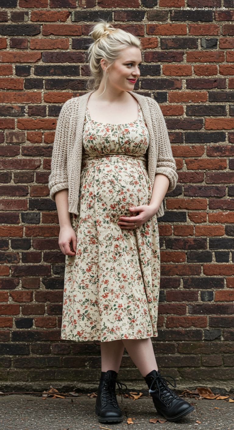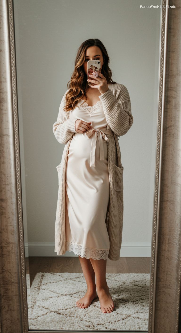Drawing inspiration from the soft, feminine aesthetics of early 20th-century loungewear, this ensemble reimagines comfort with a contemporary sensibility. A delicate champagne slip dress, featuring elegant lace trim at the neckline and hem, is layered under a longline chunky knit cardigan in a complementary neutral tone. The relaxed silhouette of the cardigan offers warmth and modesty, while the satin tie cinches the waist, creating a flattering line that accommodates various body types, particularly those seeking comfort and style during pregnancy or for a relaxed, feminine aesthetic. This outfit is perfect for cozy evenings at home, a casual brunch, or as a sophisticated maternity look.