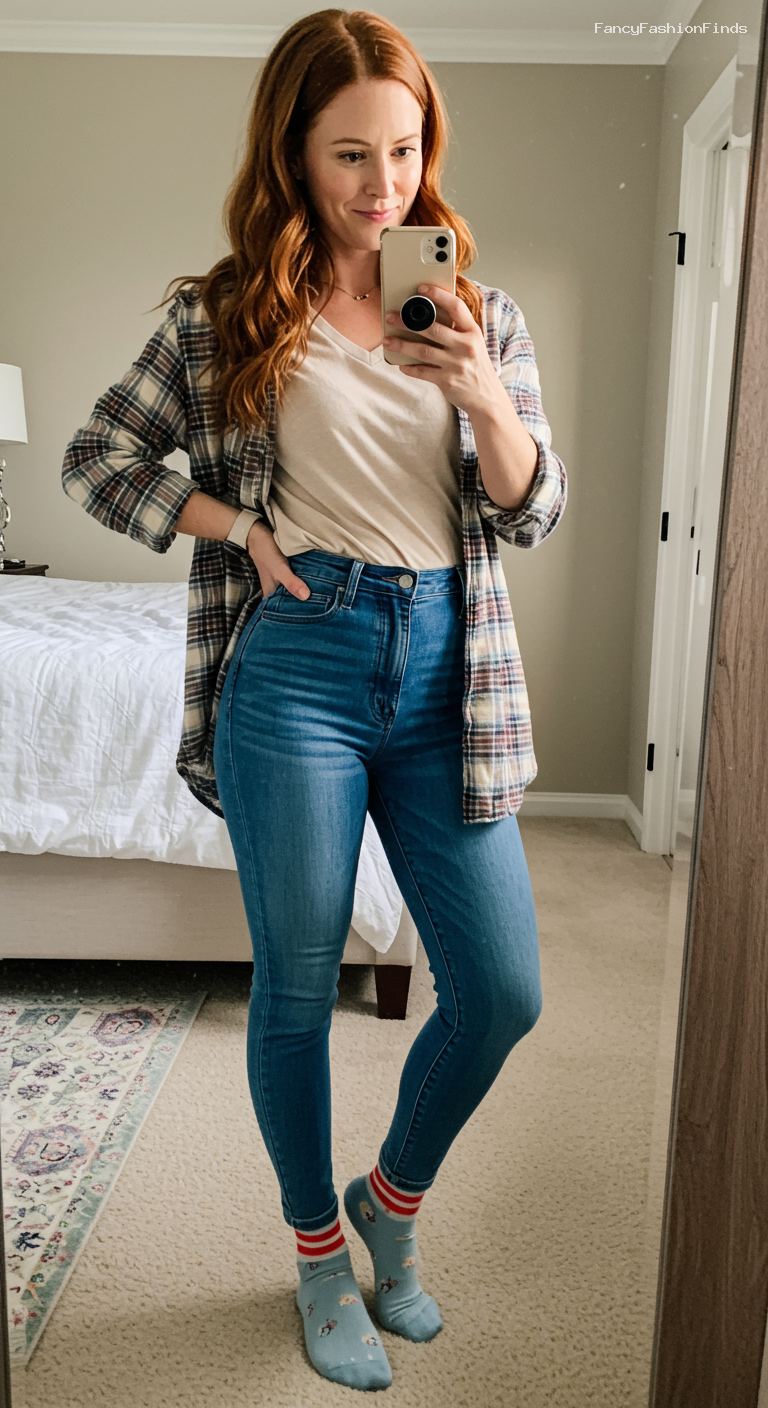 The relaxed plaid flannel shirt expertly balances the sleek, form-fitting neutral bodysuit, creating a harmonious blend of comfort and casual style. This pairing offers a versatile aesthetic, ideal for those who favor an understated yet chic personal style and appreciate practical, adaptable clothing. The soft, warm tones of the bodysuit and the classic plaid pattern make it suitable for relaxed home wear, casual outings, or even a cozy work-from-home ensemble. Its comfortable silhouette would flatter various body types, particularly those seeking a comfortable and contemporary look.