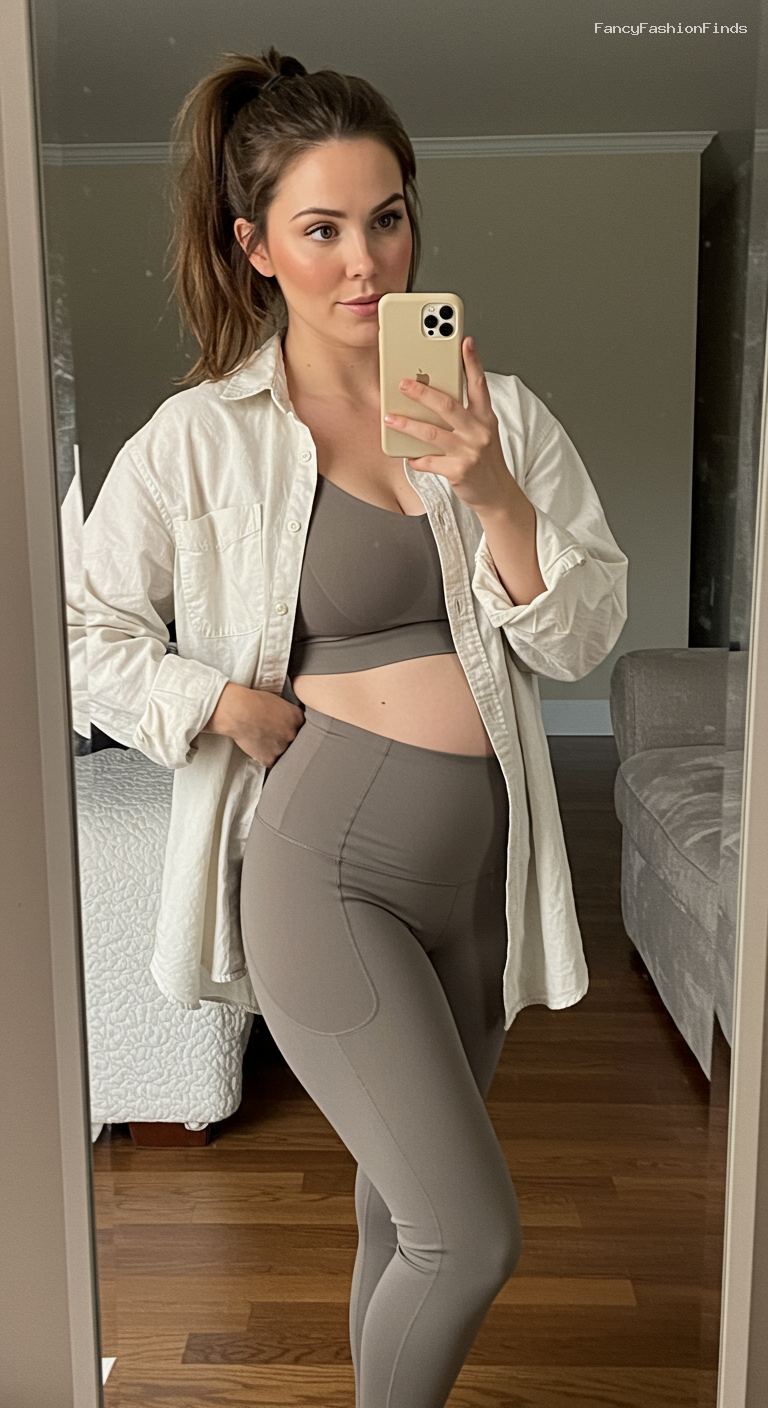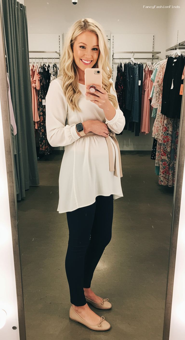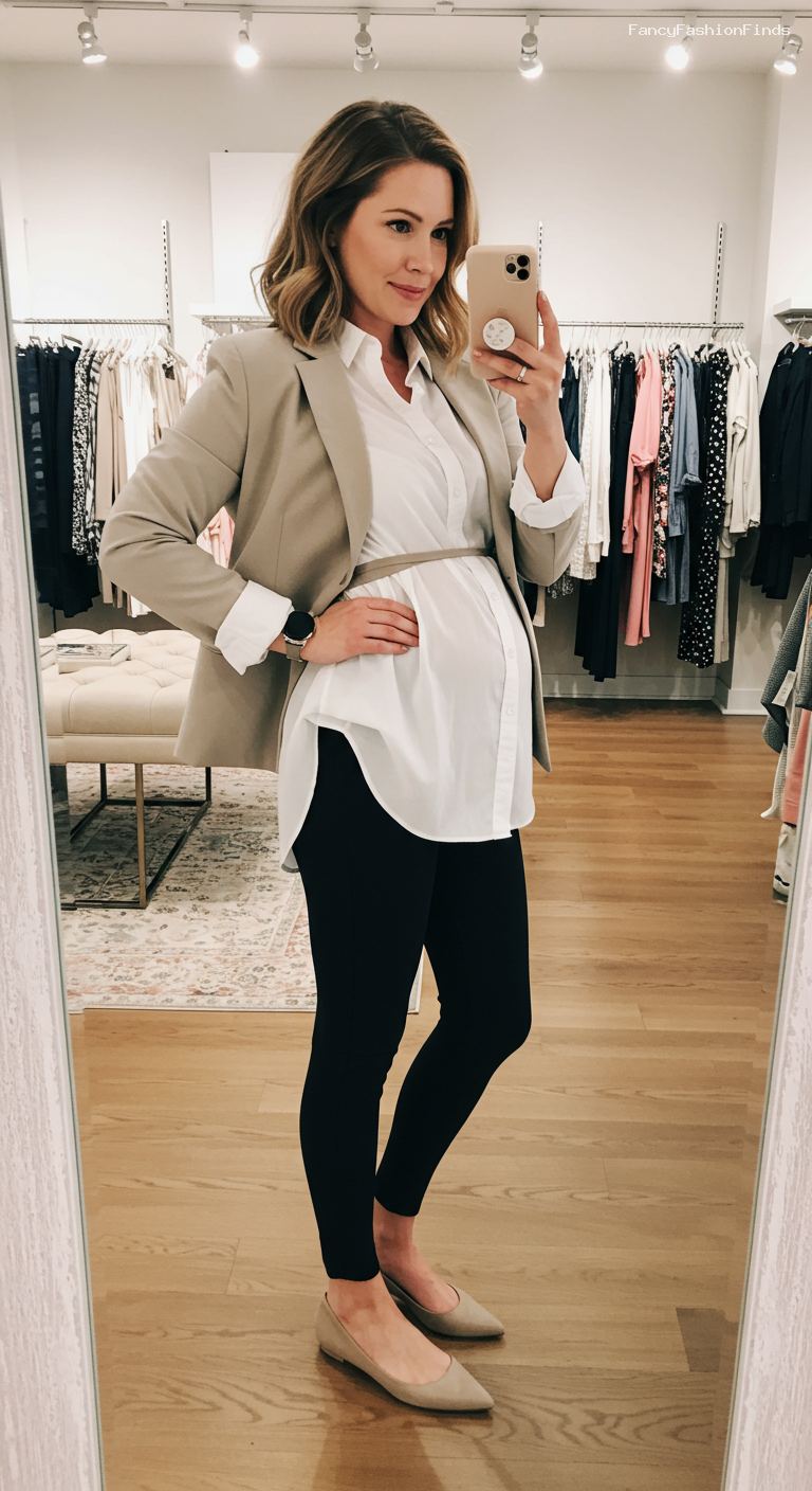 The subtle cinching of a thin belt over a crisp white tunic shirt creates a flattering silhouette, elegantly highlighting the baby bump while maintaining a polished aesthetic. Layered under a tailored beige blazer, this combination offers a refined yet comfortable option for expecting mothers. Paired with sleek black leggings and neutral pointed-toe flats, this outfit is perfect for professional settings, casual outings, or even a chic baby shower. It effortlessly balances comfort and sophistication, suiting various body types and personal styles.