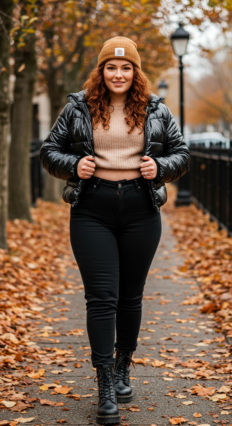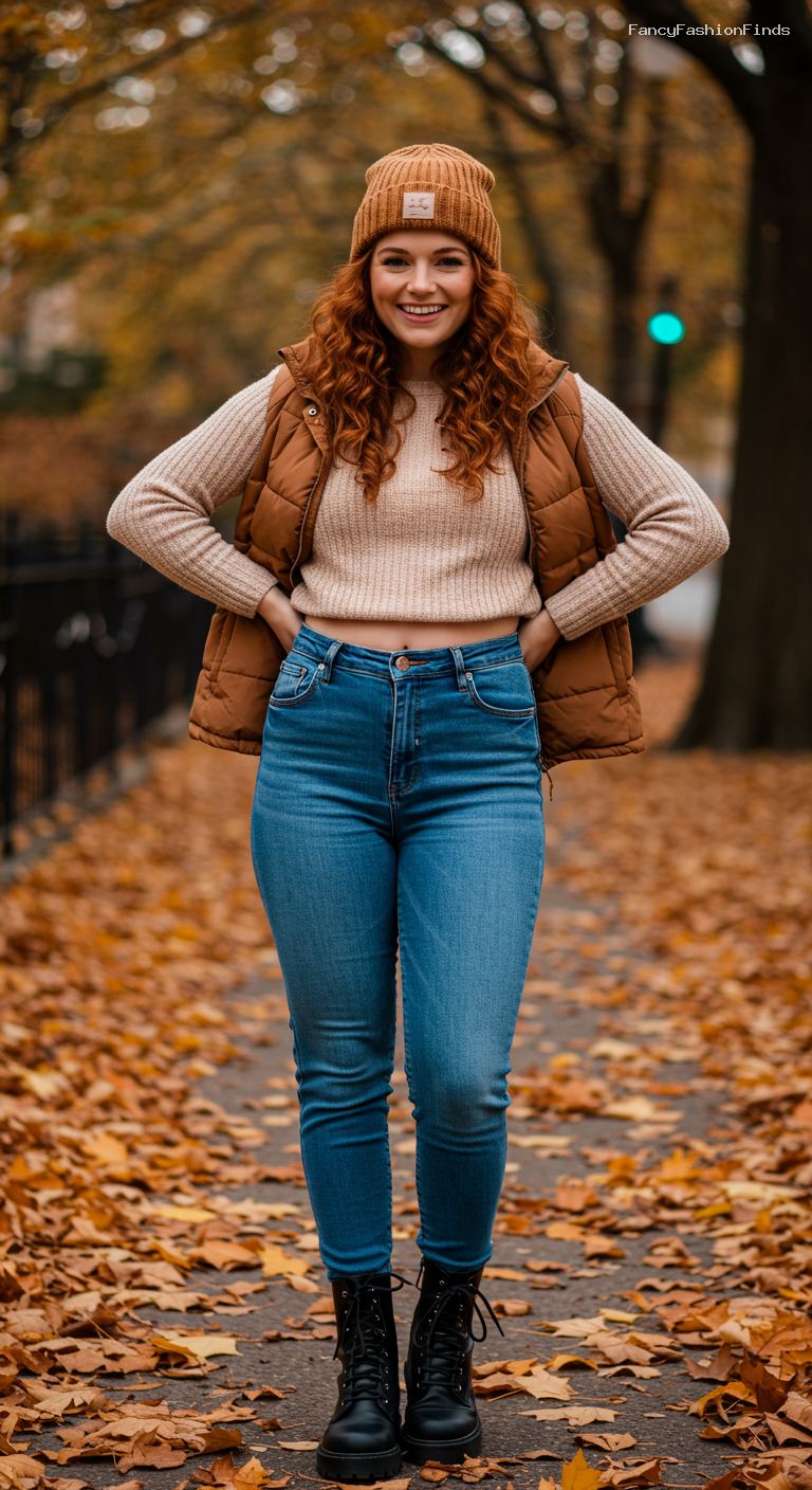 Exuding a cozy and approachable autumn vibe, this ensemble combines practical warmth with casual style. The ribbed knit sweater in a soft beige pairs beautifully with a rich brown puffer vest, creating a harmonious color palette perfect for the season. Slim-fit blue jeans complement the layered top, while chunky black combat boots add an edgy, grounded element. This outfit is ideal for an active day out, like a casual coffee run or a stroll through a park, and suits most body types, especially those who appreciate comfortable yet chic everyday wear.