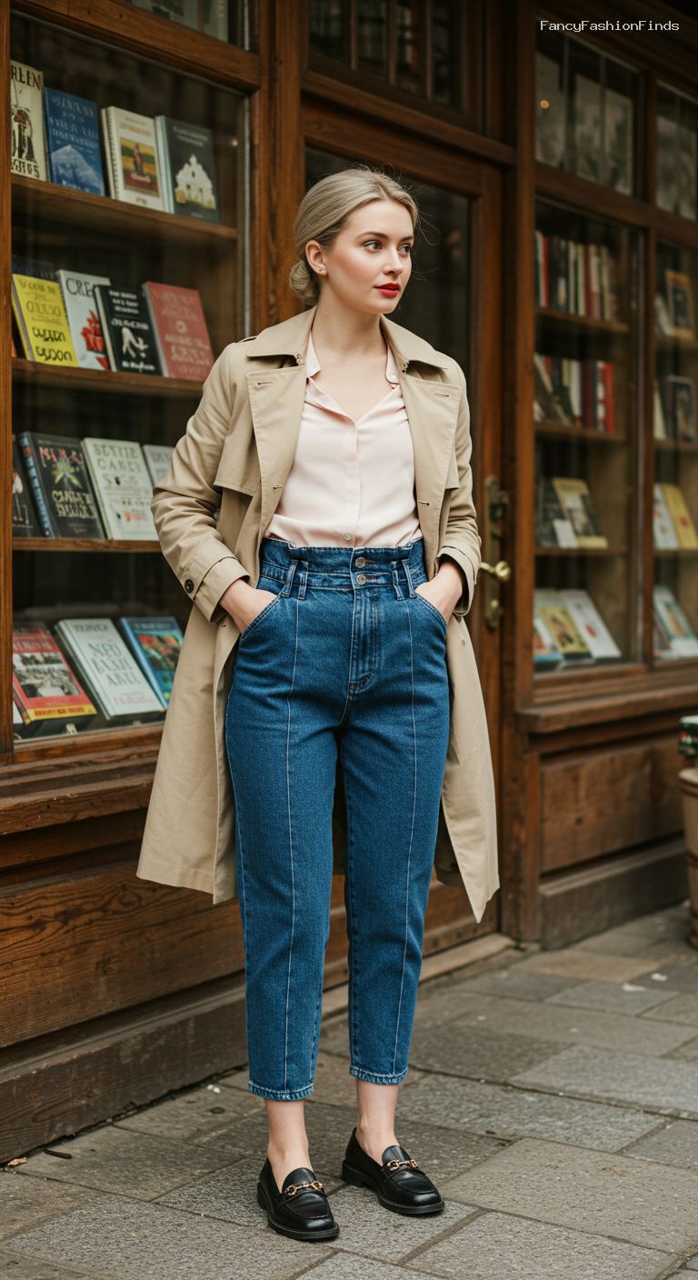 The tailored trench coat, soft pink blouse, and high-waisted denim create a harmonious blend of relaxed refinement. This versatile combination is ideal for a smart casual aesthetic, suitable for various body types seeking comfortable yet polished style. The structured denim with its front seam detailing elevates the look, while classic black loafers with gold hardware add a touch of sophisticated flair, perfect for a day of city exploration or a relaxed professional setting.