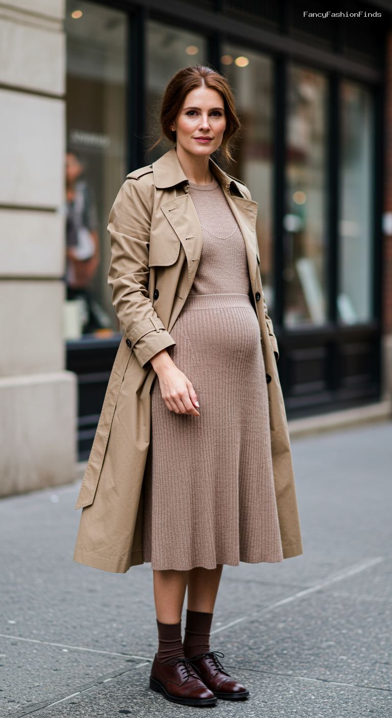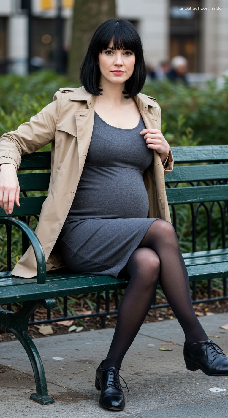 Exuding a sophisticated yet comfortable urban vibe, this outfit masterfully blends practicality with refined style. The form-fitting charcoal gray maternity dress provides a sleek foundation, beautifully complemented by the classic beige trench coat draped over the shoulders. Black opaque tights and polished black oxfords complete the ensemble, offering a smart finish that is ideal for expecting mothers seeking both elegance and ease in professional or casual city settings.