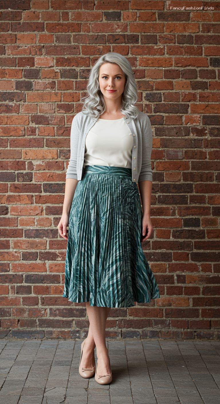 The color story of this ensemble is beautifully balanced, pairing a soft cream top and a light grey cardigan with a vibrant, pleated midi skirt in shades of teal and deep green. The flowing skirt, featuring a subtle leaf-like pattern, offers movement and visual interest, perfectly complemented by the understated top and delicate cardigan. This outfit is versatile for various body types, particularly flattering for those who appreciate a defined waist and a relaxed silhouette, making it ideal for a relaxed office environment, brunch, or a casual daytime event. The combination of classic comfort and a touch of playful print creates a polished yet approachable aesthetic.