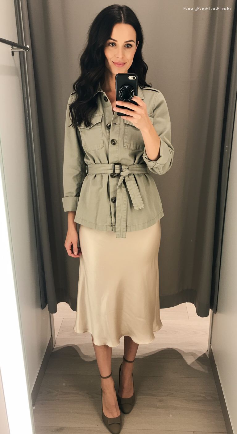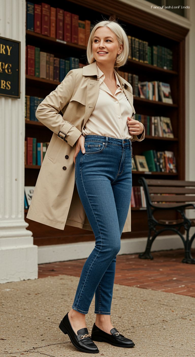 The seamless blending of classic trench coat with modern denim creates a sophisticated yet approachable aesthetic. A pale champagne-hued button-down adds a touch of refined elegance, harmonizing with the neutral outerwear. This versatile combination is ideal for various body types, offering a polished silhouette suitable for smart casual outings, daytime appointments, or a relaxed professional environment.