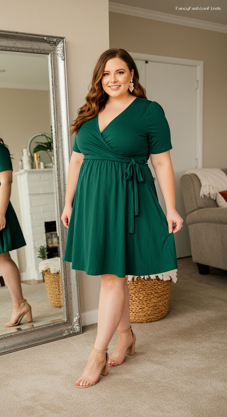 Drawing inspiration from classic feminine silhouettes, this rich emerald green wrap dress combines comfort with polished style. The v-neckline and tie-waist detail flatter various body types, particularly accentuating the waist for an hourglass or pear shape. Its soft jersey fabric drapes beautifully, making it an ideal choice for a casual workday, a relaxed brunch, or an evening out.