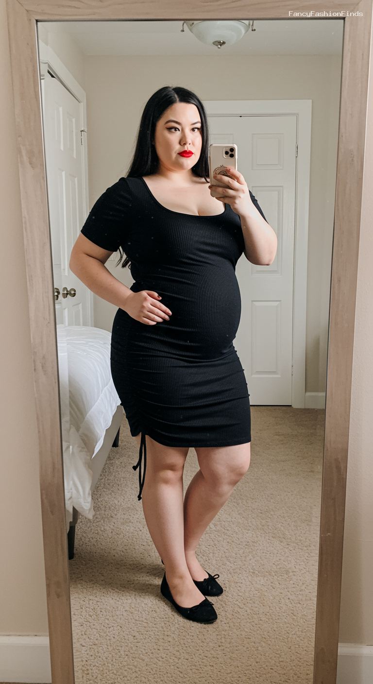 The subtle vertical ribbing of this fitted black mini dress offers a textural dimension, enhancing its sleek silhouette. Its short sleeves and adjustable ruching on the sides provide a customizable fit, gracefully accentuating curves without sacrificing comfort. This versatile piece is ideal for individuals seeking a chic yet understated look, suitable for casual outings or semi-formal gatherings. Paired with classic black flats, it creates an effortlessly polished ensemble that can be easily dressed up or down.