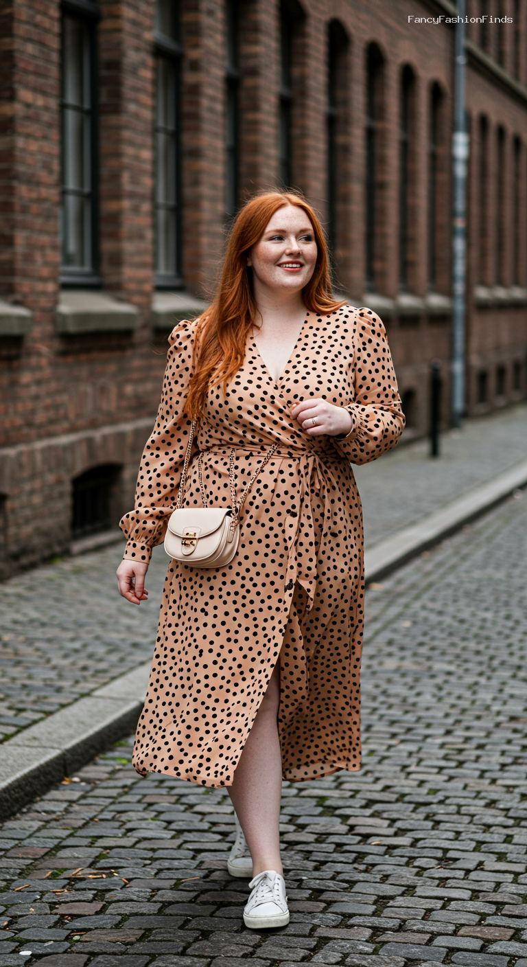 The unique pairing of a classic polka dot wrap dress with casual white sneakers creates an unexpected yet harmonious blend of comfort and chic. This versatile midi dress, featuring a flattering V-neck and tie waist, gracefully drapes to a midi length with a subtle side slit, offering both movement and refined style. Complemented by a small cream crossbody bag with chain detailing, the ensemble is ideal for those who appreciate relaxed elegance and would suit most body types. Perfect for a casual brunch, a day of city exploration, or a relaxed office environment.