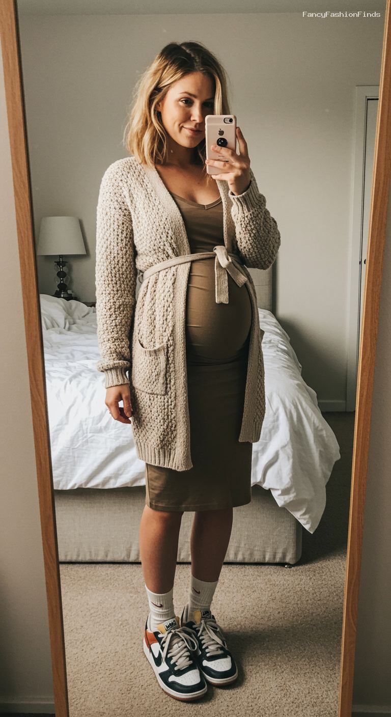 The textured, chunky knit cardigan serves as the anchor for this relaxed yet put-together ensemble. Its neutral beige tone and tie-waist detail effortlessly layer over a form-fitting olive midi dress, creating a harmonious blend of comfort and style. This look is ideal for casual outings, a relaxed workday, or cozy weekend gatherings, offering a chic option for those who prioritize both ease and a modern aesthetic, particularly complementing a changing silhouette.