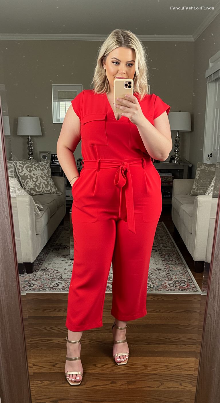Perfect for a festive gathering or an evening out, this striking red jumpsuit offers a sophisticated yet comfortable alternative to a dress. The belted waist accentuates the figure, while the wide-leg, cropped silhouette provides a modern edge that flatters various body types, particularly pear and hourglass shapes. Paired with elegant gold strappy heels, the vibrant hue and refined tailoring create a cohesive and polished statement for any fashion-conscious woman seeking effortless style.