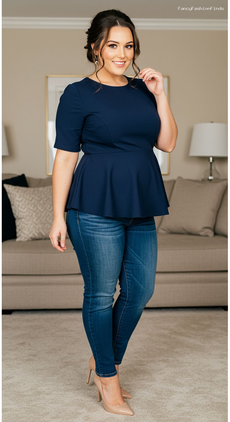 The tailored peplum top and classic blue jeans combine to create a balanced silhouette that flatters a variety of figures, particularly enhancing an hourglass shape or adding definition to a straight frame. This sophisticated yet approachable pairing, featuring a rich navy hue and fitted denim, offers a versatile foundation for many occasions. Nude pointed-toe heels subtly elongate the legs, making it suitable for casual work environments, brunches, or an elevated everyday aesthetic.