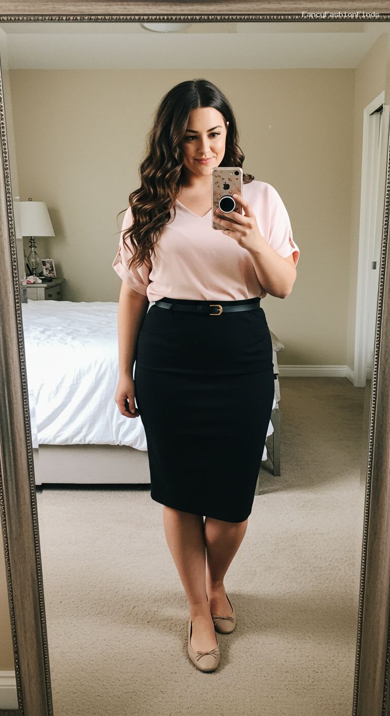 The soft, flowing fabric of the blush pink top provides a gentle contrast to the structured black pencil skirt, creating a balanced and refined aesthetic. A slim black belt accentuates the waist, offering a flattering silhouette that works well for various body types, especially those seeking to define their midsection. This versatile pairing is ideal for office environments, business casual meetings, or even a sophisticated daytime event. Nude ballet flats complete the ensemble, maintaining comfort while preserving an elegant and polished appearance.