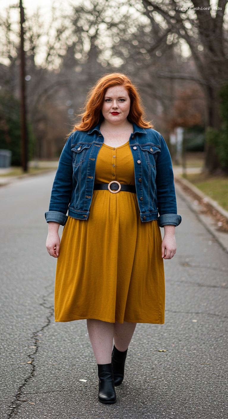 The striking combination of a rich mustard midi dress and a classic denim jacket creates a cohesive and effortlessly chic aesthetic. A black belt with a natural-toned buckle cinches the waist, defining the silhouette, while black ankle boots complete this versatile ensemble. This look beautifully complements a range of body types, particularly those seeking to highlight their waist, and is perfect for casual outings, weekend brunches, or relaxed daytime events.