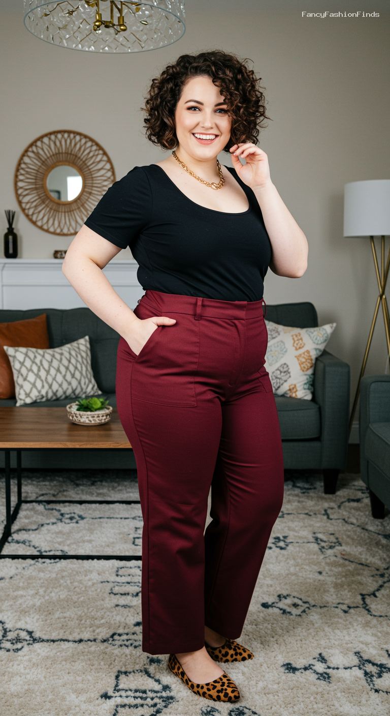 Tucking in a simple black tee creates a clean, polished silhouette, perfectly balancing the rich hue of the maroon wide-leg trousers. The high-waisted fit of the pants visually elongates the legs, a flattering choice for various body types, especially those seeking to define their waistline. Leopard print flats add a playful yet chic contrast, while a chunky gold chain necklace introduces a touch of refined elegance. This ensemble offers a smart-casual aesthetic ideal for a relaxed workday or an afternoon outing.