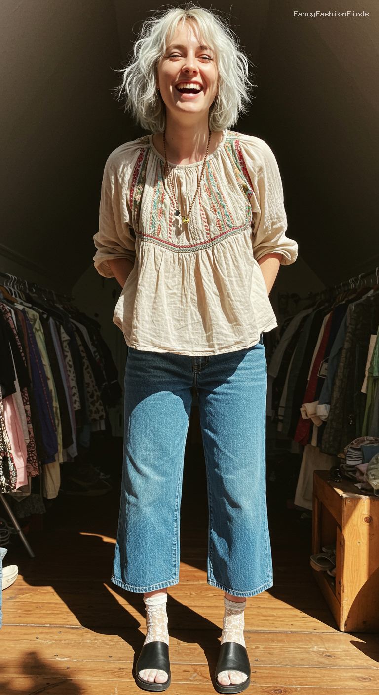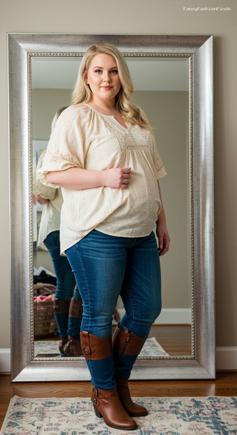 Perfect for a casual weekend outing or a relaxed gathering with friends, this ensemble offers both comfort and understated style. The cream-colored embroidered peasant blouse introduces a touch of bohemian elegance, harmonizing beautifully with classic blue skinny jeans. Rich brown riding boots, featuring buckle detailing, ground the look with a rustic yet polished appeal, making it ideal for those who appreciate relaxed sophistication and a versatile silhouette.