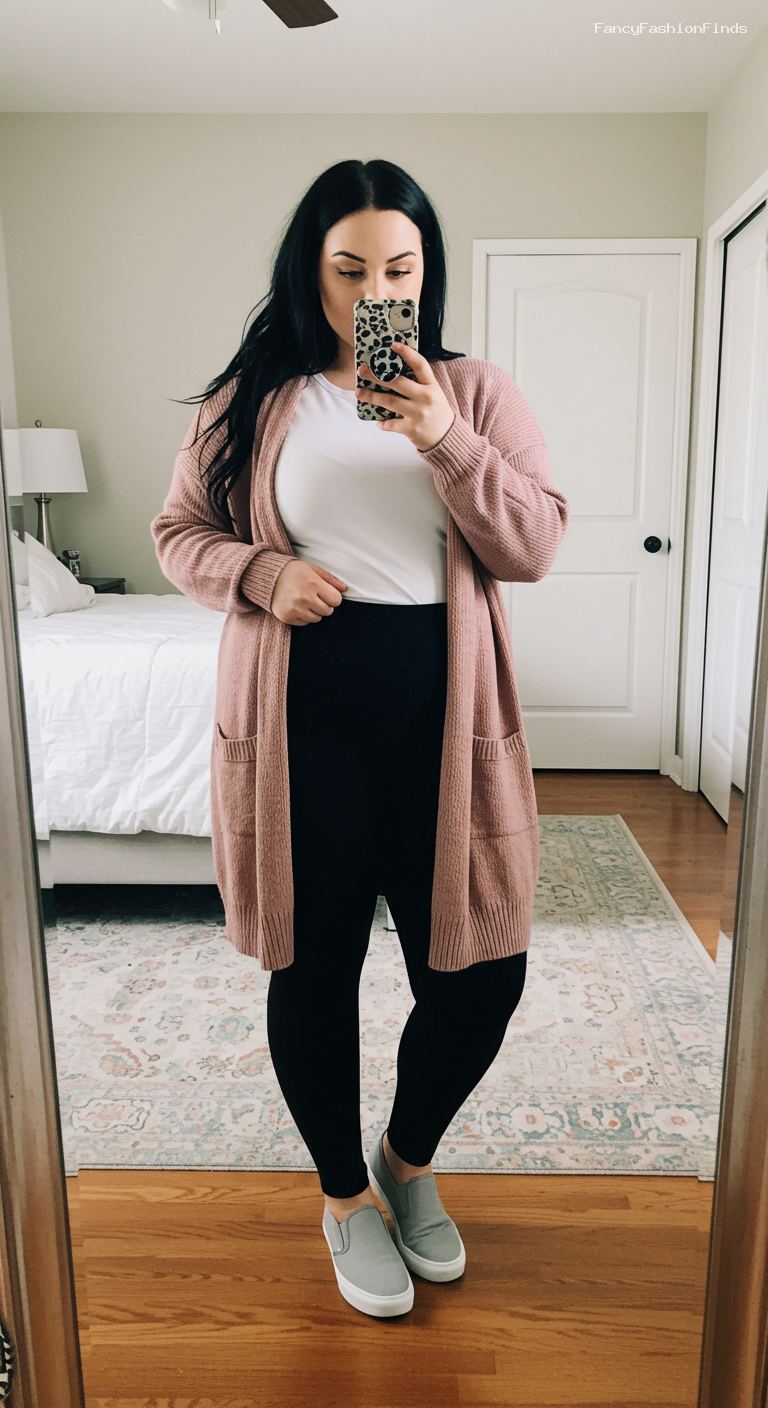 The soft blush of the longline cardigan creates a warm, inviting contrast against the crisp white tee and sleek black leggings. This relaxed yet put-together combination is perfect for a casual day out or comfortable travel, offering both style and ease. The long, flowing silhouette of the cardigan flatters various body types, providing a graceful drape that can be dressed up or down. Finished with light grey slip-on sneakers, this ensemble embodies effortless chic for the modern woman on the go.