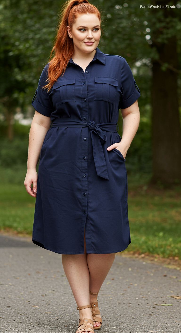 A relaxed yet refined vibe emanates from this navy utility shirt dress, offering a versatile foundation for various casual settings. The short-sleeved design, complete with rolled cuffs and practical chest pockets, contributes to its laid-back appeal, while the tie-waist accentuates the silhouette for an hourglass effect. This piece is ideal for those who appreciate comfort without sacrificing style, particularly complementing apple or pear body types seeking definition. Pairing it with simple nude sandals creates a polished ensemble suitable for daytime outings, garden parties, or even a smart-casual office environment.
