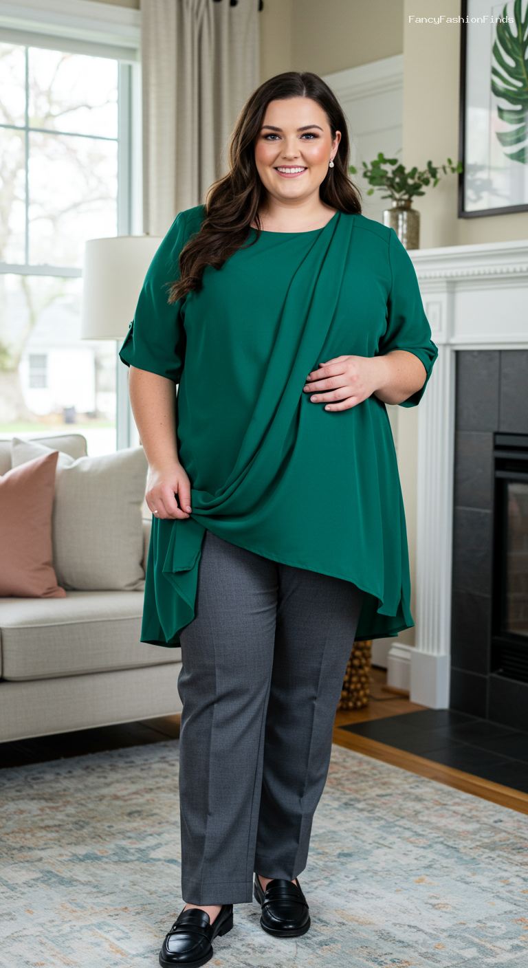 The striking asymmetrical drape of the emerald green tunic immediately draws the eye, offering a sophisticated and flattering silhouette. Paired with tailored charcoal grey trousers and classic black loafers, this ensemble creates a polished yet comfortable aesthetic. This versatile look is ideal for professional women seeking a stylish office outfit or an elegant choice for business casual events, complementing various body types with its relaxed fit and strategic design.