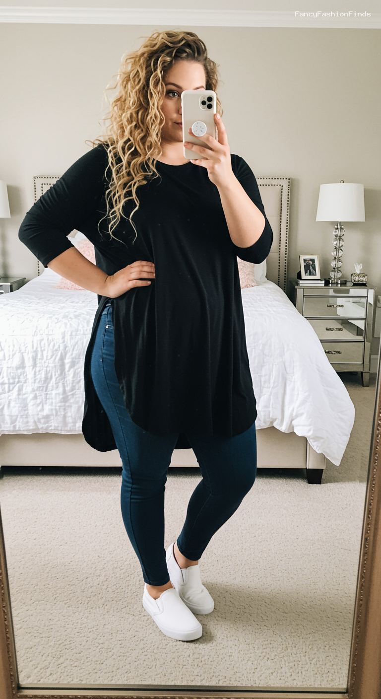 The relaxed silhouette of the black tunic top, featuring a high-low hem and side slits, pairs seamlessly with dark wash skinny jeans, creating a balanced and comfortable profile. This combination offers a flattering fit for various body types, particularly those seeking a modest yet modern aesthetic. White slip-on sneakers complete the ensemble, adding a fresh, casual touch. It’s an ideal choice for everyday errands, casual meet-ups, or relaxed weekend activities.