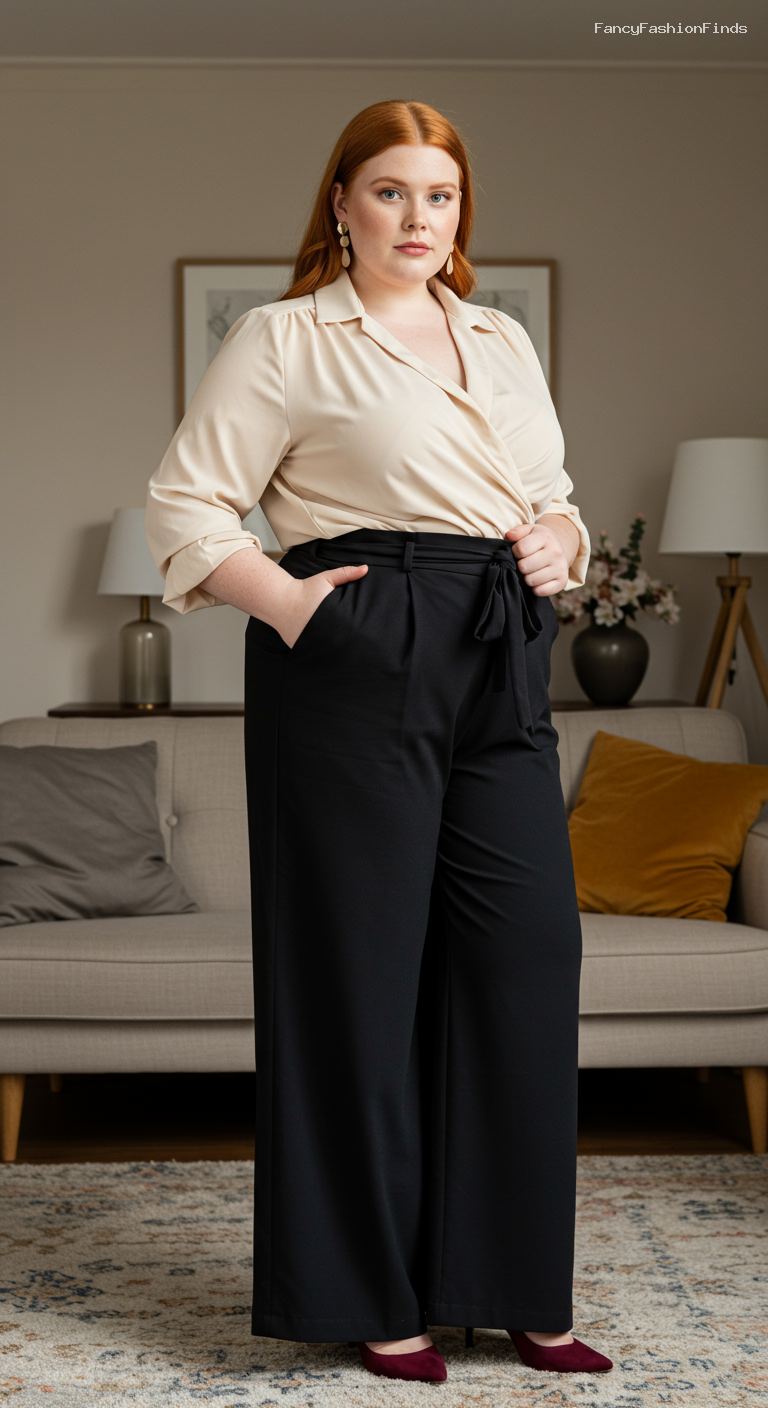 Perfect for transitional seasons, this ensemble offers both comfort and polished style. The soft beige wrap blouse, with its relaxed collar and cuffed sleeves, creates an elegant upper silhouette that pairs beautifully with the high-waisted, wide-leg black trousers. These trousers, cinched with a matching fabric tie, provide a flattering drape and elongate the leg, making this outfit suitable for various body types seeking a refined yet comfortable look. It’s an ideal choice for professional settings, smart casual events, or an elevated workday from home.