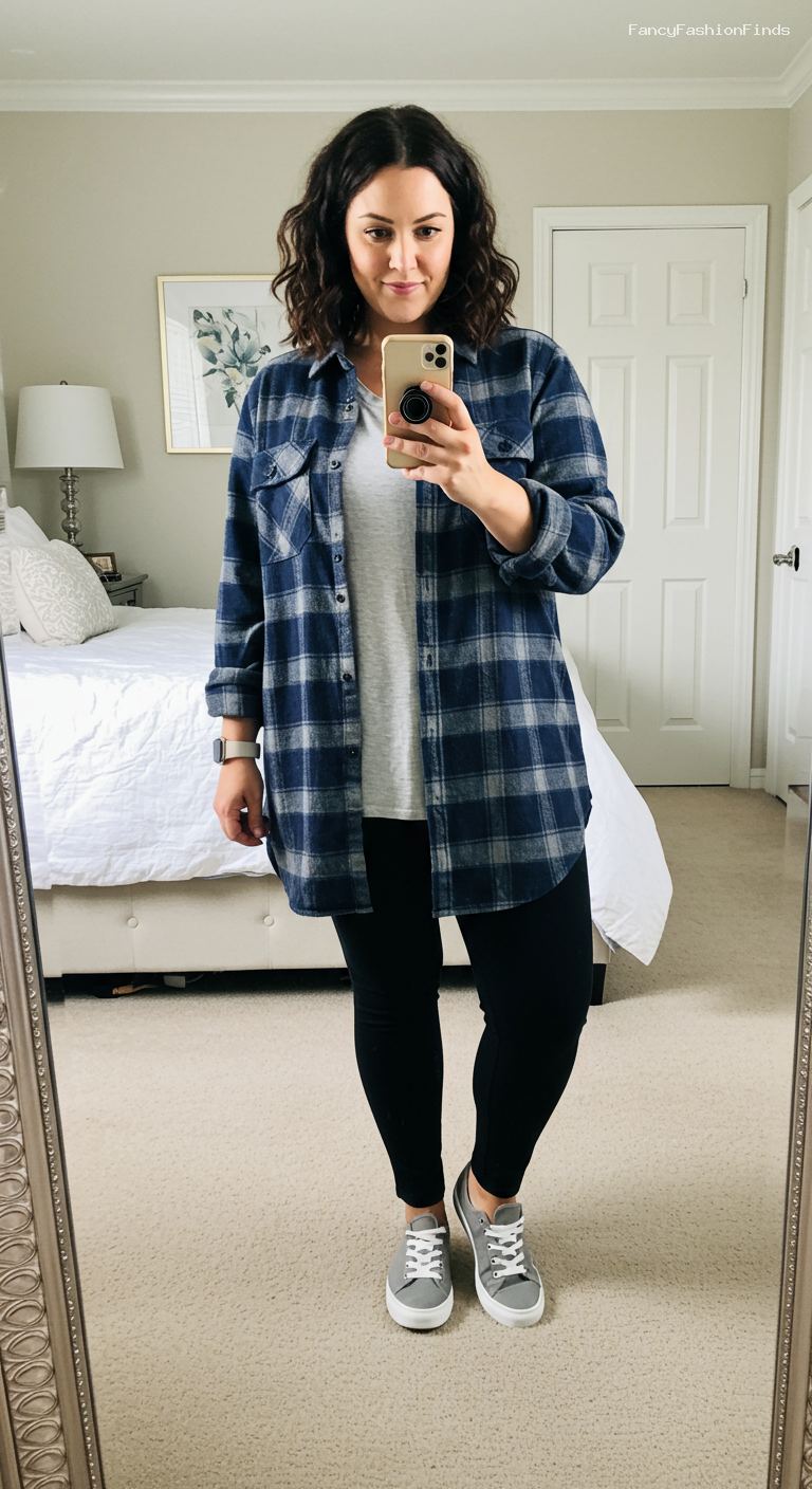 The soft, brushed flannel of the oversized navy and grey plaid shirt jacket instantly conveys a sense of relaxed comfort, perfectly layered over a simple grey tee. This effortless combination, paired with black leggings and grey sneakers, creates a casual yet put-together aesthetic ideal for everyday wear. It’s a versatile look that flatters most body types, particularly those who appreciate comfort and a relaxed silhouette, suitable for running errands or a laid-back weekend outing.