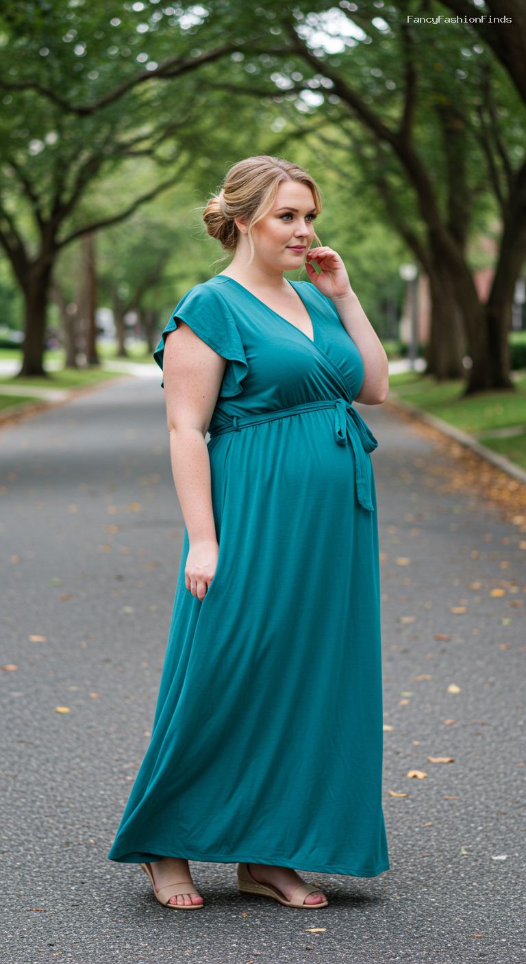 The self-tie waist detail on this flowing teal maxi dress creates a flattering silhouette, allowing for adjustable comfort and a defined shape. Its soft, draped fabric and flutter sleeves offer an elegant yet relaxed aesthetic, ideal for those who appreciate understated grace. This versatile piece, perfectly complemented by neutral wedge sandals, suits a variety of body types, particularly those seeking to highlight their waist while enjoying ample movement. It’s an excellent choice for garden parties, casual outdoor events, or a stylish daytime outing.