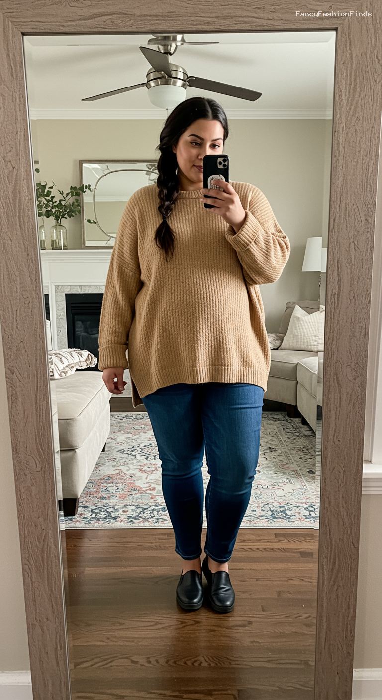 Layering a chunky, ribbed knit sweater over slim-fit denim creates an effortlessly chic silhouette, balancing volume on top with a streamlined lower half. The warm camel hue of the sweater offers a versatile base, complementing various skin tones and personal styles. This combination works well for an hourglass or pear body type, accentuating curves while providing comfortable coverage. It’s an ideal ensemble for casual outings, relaxed office environments, or weekend errands during cooler weather.