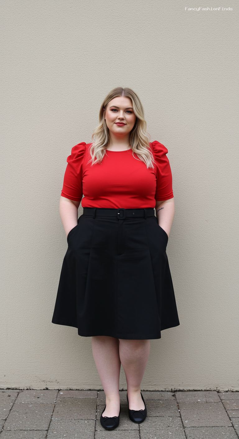 Perfect for a smart casual office environment or a relaxed weekend brunch, this outfit combines a vibrant red top with playful puffed sleeves and a classic black A-line skirt. The structured skirt, cinched with a matching black belt, beautifully balances the top’s volume, creating a flattering silhouette for various body types, especially those seeking to emphasize the waist. Black ballet flats complete the ensemble, offering both comfort and understated elegance for an effortlessly put-together appearance.