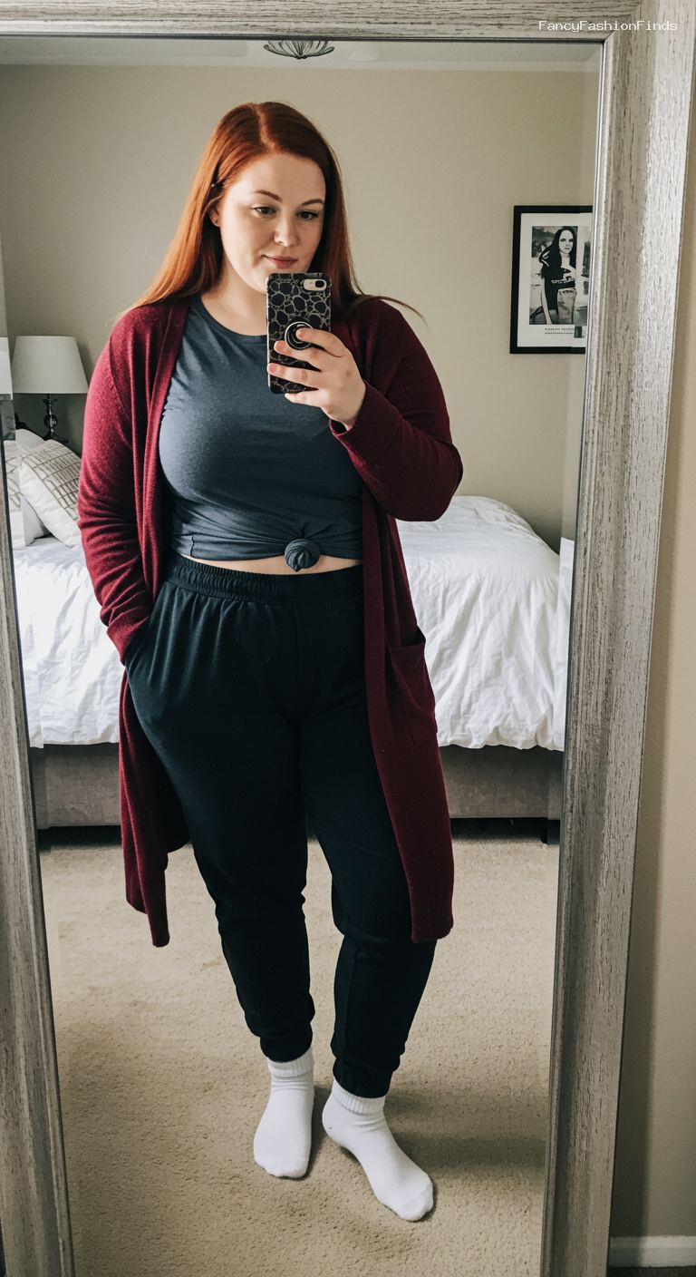 A cozy yet stylish mood emanates from this outfit, perfect for comfortable days at home or casual outings. The deep maroon duster cardigan introduces a rich pop of color over a muted charcoal tee, tied at the waist for a flattering silhouette, paired with simple black joggers. This versatile combination works well for various body types, offering both comfort and an effortlessly put-together aesthetic. It’s an ideal choice for running errands, lounging, or a relaxed coffee date, appealing to those who prioritize comfort without sacrificing style.