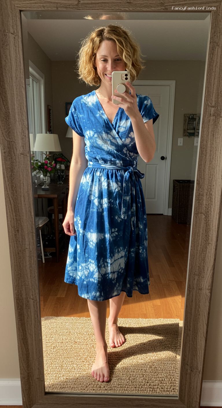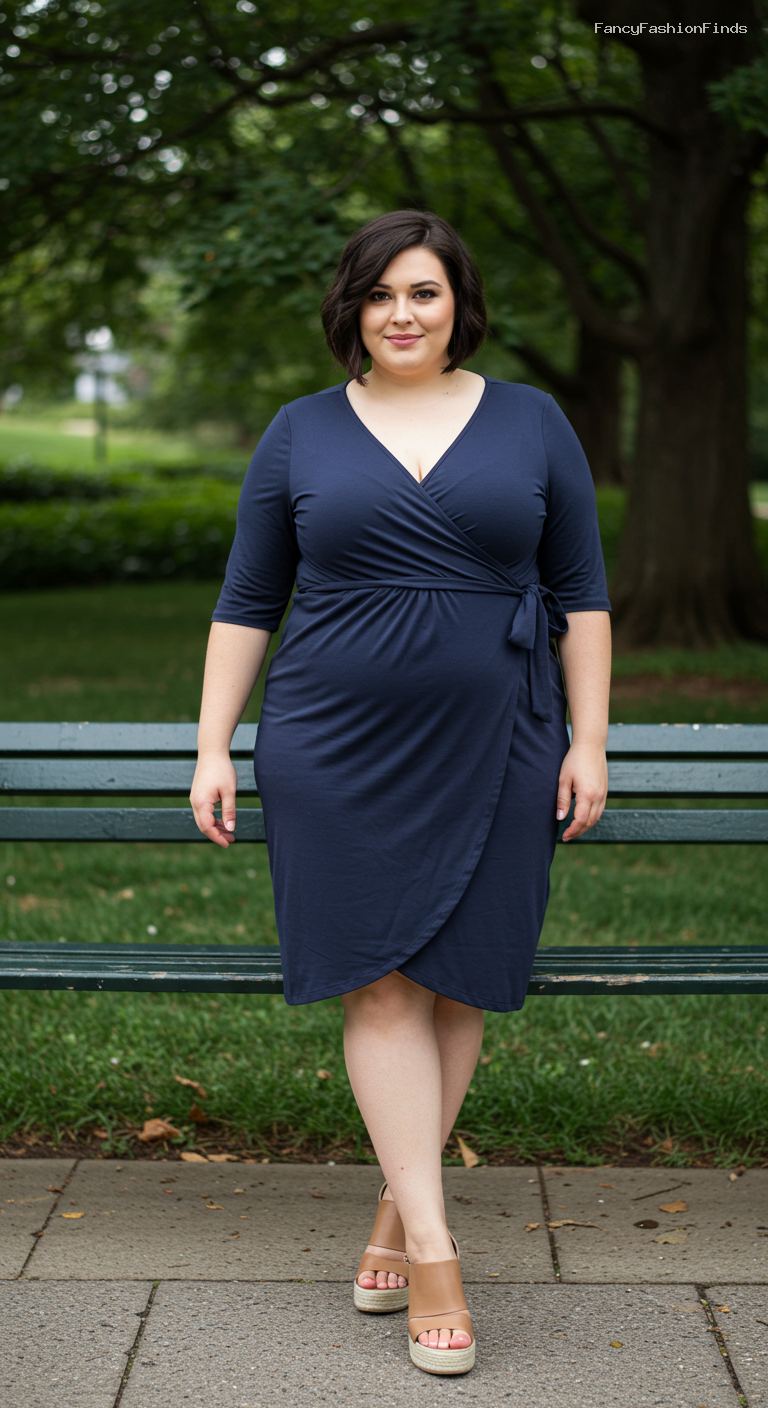 The self-tie waist on this navy wrap dress creates a flattering silhouette, cinching at the narrowest part of the torso. Its V-neckline and three-quarter sleeves offer a balanced, adaptable style suitable for various body types, particularly complementing hourglass or pear shapes. Paired with espadrille wedge sandals, the ensemble is perfect for a smart-casual office environment, a daytime event, or an elegant weekend outing.