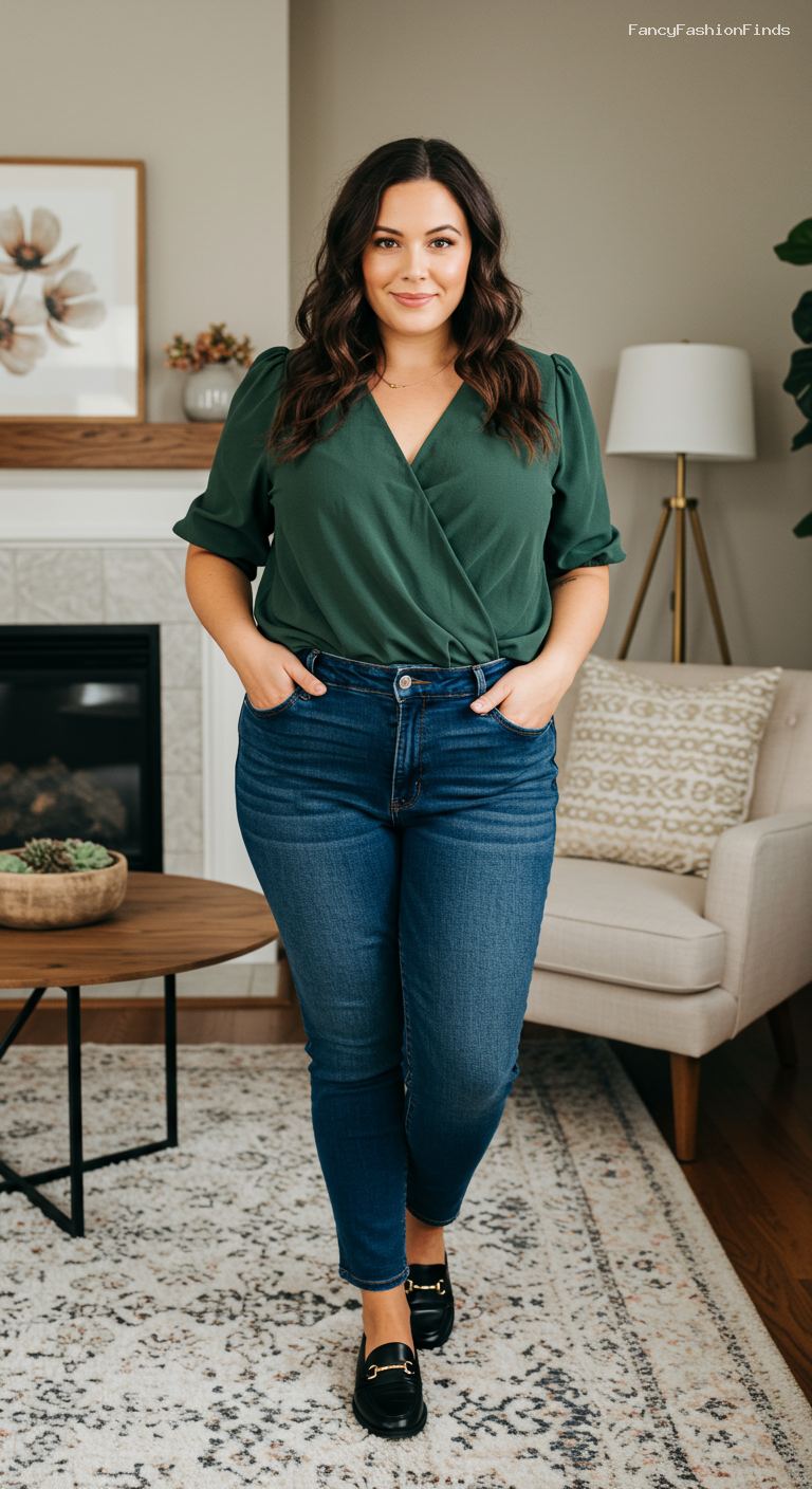 The rich emerald green blouse, with its flattering v-neck and subtle puff sleeves, harmonizes effortlessly with the dark wash skinny jeans, creating a balanced and polished aesthetic. This versatile pairing offers a comfortable yet refined silhouette, ideal for various body types seeking a smart casual appeal. The outfit is completed by classic black loafers featuring a gold bit, adding a touch of sophisticated detail suitable for a relaxed workday or a weekend brunch.