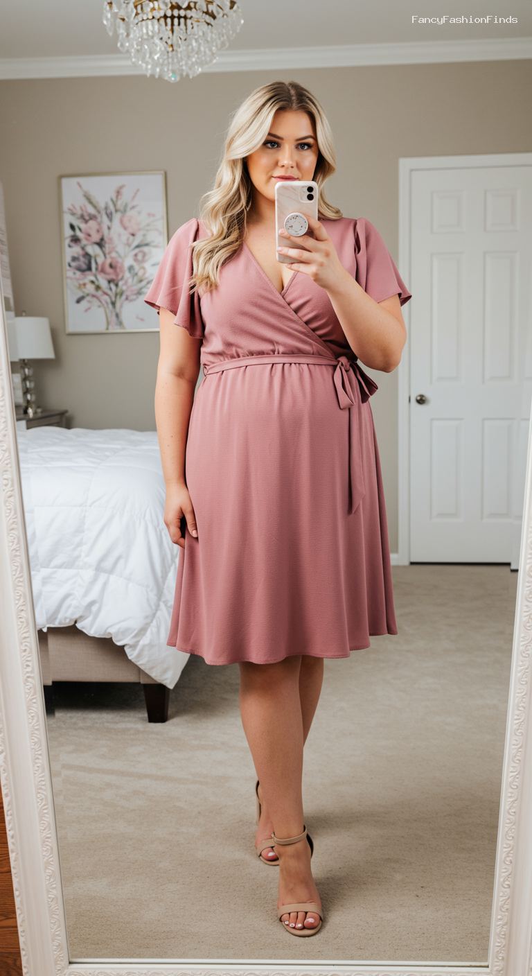 Drawing inspiration from classic feminine silhouettes, this dusty rose wrap dress offers a flattering and adaptable option. Its V-neckline and flutter sleeves create a soft, romantic aesthetic, while the adjustable waist tie accentuates the natural waistline. This versatile piece, ideal for various body types, transitions seamlessly from a daytime luncheon to an evening gathering, especially when paired with simple nude heels.
