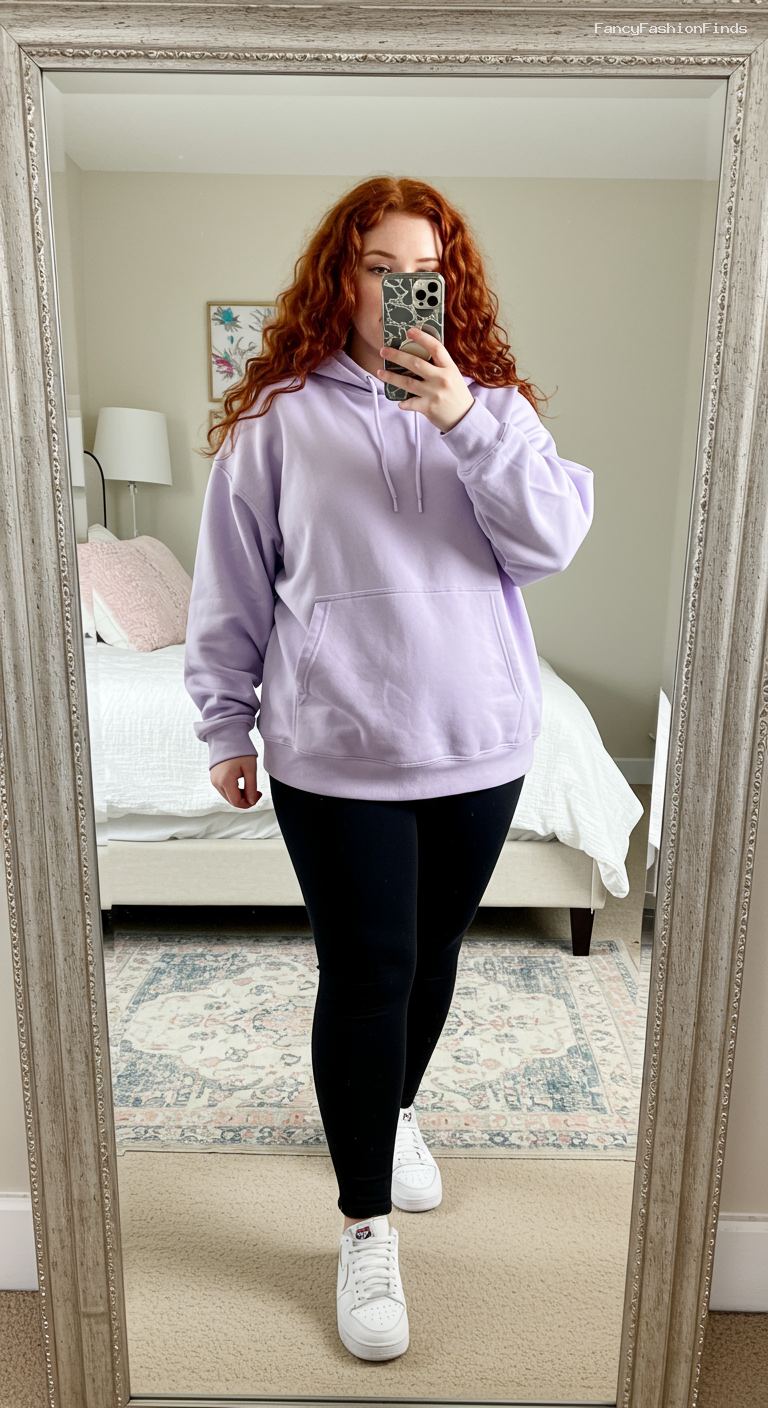 The soft, plush texture of the oversized lavender hoodie offers an inviting sense of ease and comfort. Paired with sleek black leggings, the ensemble balances relaxed proportions with a streamlined silhouette. This casual combination is perfect for a relaxed weekend, running errands, or a cozy day at home, suiting various body types that appreciate comfort without sacrificing style. White athletic sneakers complete the look, adding a clean, sporty touch that enhances its effortless appeal.