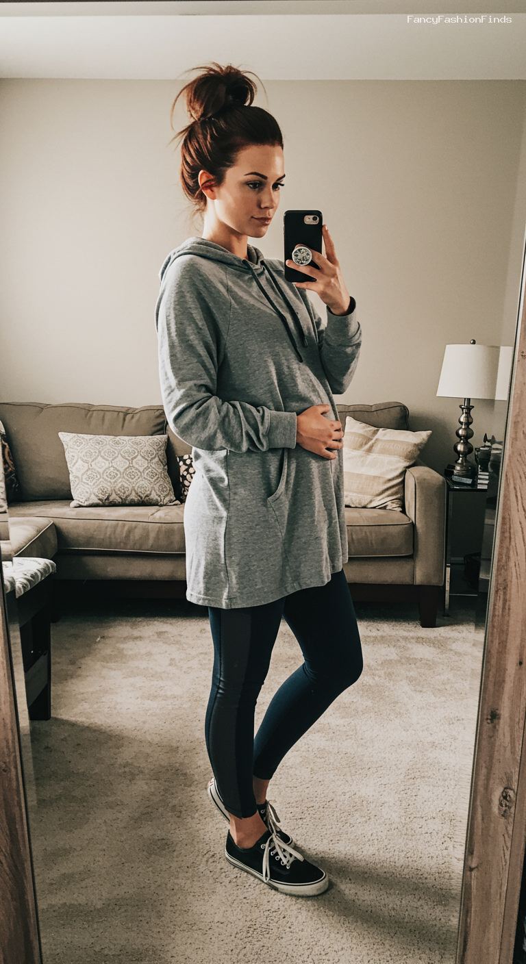 Perfect for cooler weather or a relaxed weekend, this outfit champions effortless comfort. The elongated grey hooded tunic offers a generous, flowing silhouette, making it ideal for various body types, particularly those seeking a modest yet stylish option. Paired with sleek black leggings, the look strikes a balance between coziness and a streamlined aesthetic, while classic black sneakers complete this laid-back ensemble, suitable for errands or a casual coffee date.