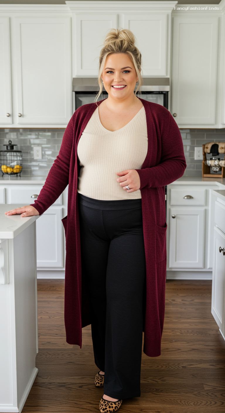 The striking longline burgundy cardigan instantly elevates this relaxed outfit, creating a sophisticated silhouette over a ribbed cream-colored top. Paired with comfortable black wide-leg trousers and leopard print flats, the look achieves a perfect balance of ease and polished style. This versatile combination is ideal for various body types, offering a flattering drape and comfortable fit suitable for casual Fridays, weekend errands, or a cozy evening at home.