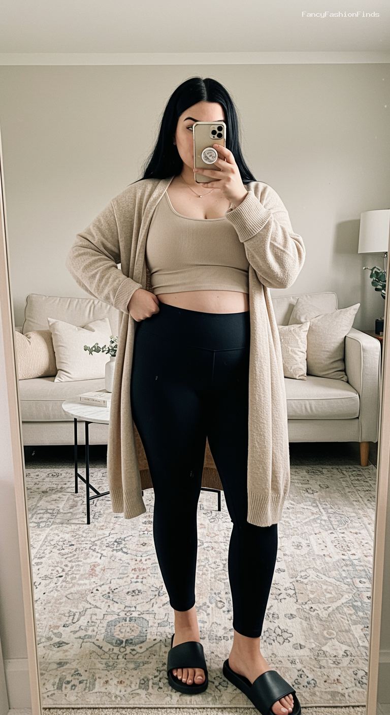 Layering an elongated cardigan over a fitted ribbed crop top creates a balanced silhouette, offering both comfort and a refined aesthetic. The interplay of the soft beige top and duster with sleek black leggings and slides provides a versatile foundation for various casual settings. This combination is particularly flattering for those who appreciate a relaxed yet put-together personal style, suitable for running errands or a cozy day at home. The neutral palette ensures easy integration into any wardrobe.