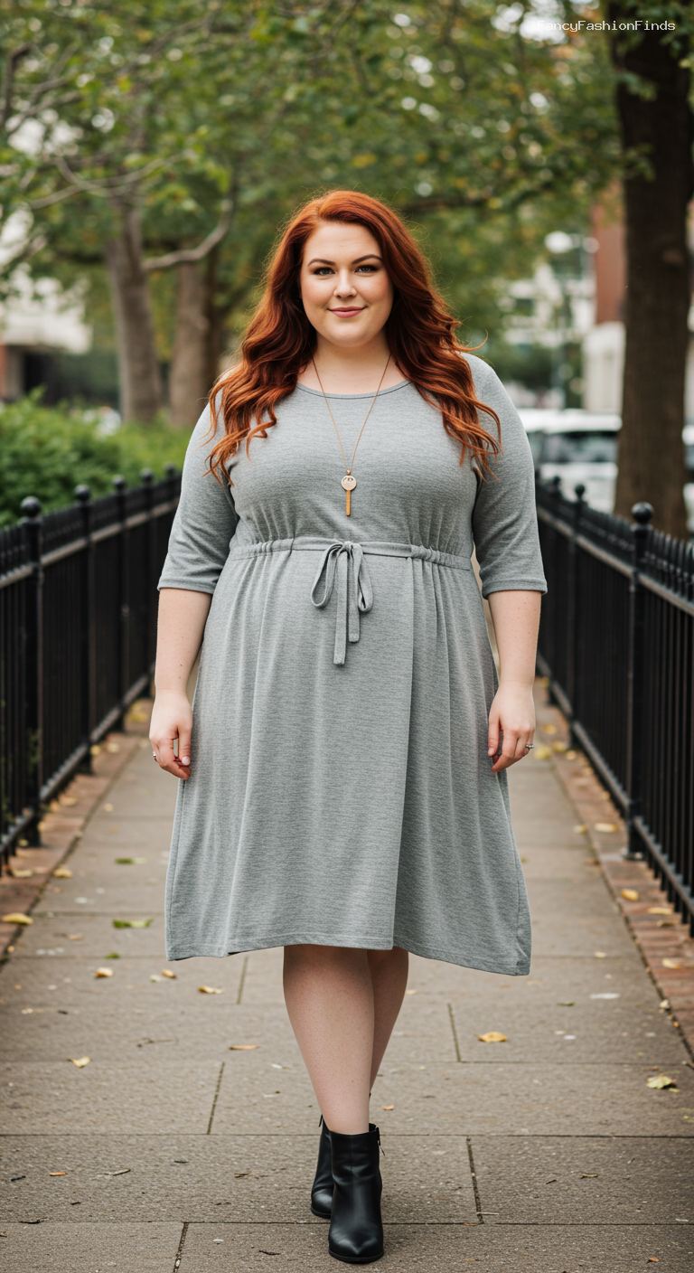 Perfect for a casual weekend outing or a relaxed workday, this ensemble prioritizes comfort without sacrificing style. The soft grey midi dress, with its flattering drawstring waist, accentuates the natural silhouette and provides an easy, breathable fit. Paired with sleek black ankle boots and a delicate pendant necklace, the look achieves a balanced blend of relaxed charm and subtle sophistication. This versatile outfit suits various body types and is ideal for those seeking a practical yet polished aesthetic for their daily activities.