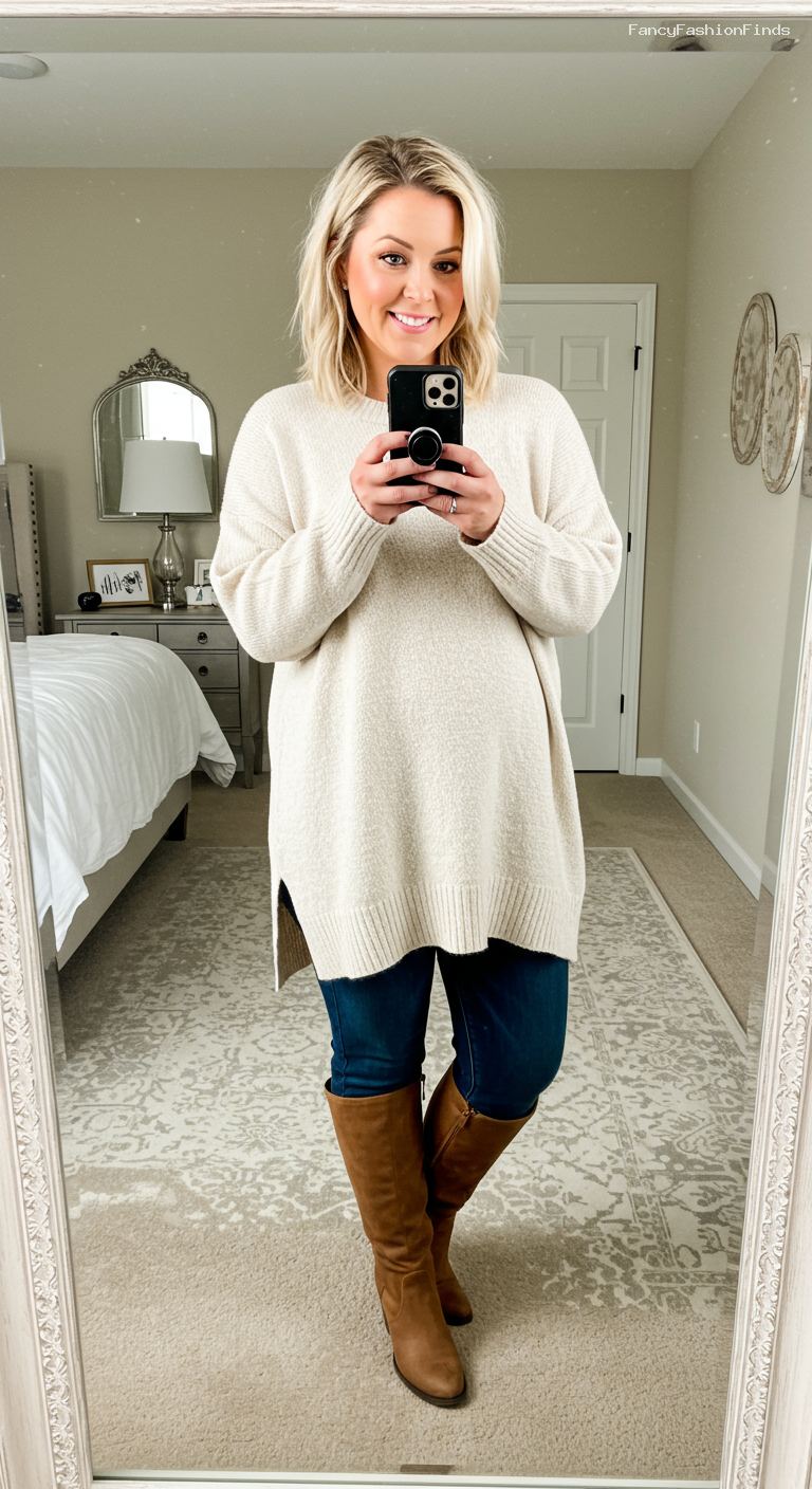 The harmonious color story of this outfit centers around a soft cream tunic sweater, rich indigo denim, and warm chestnut knee-high boots. This relaxed yet polished combination is ideal for various body types, offering comfortable coverage with a stylish silhouette that flatters. The oversized sweater’s texture adds depth, while the clean lines of the jeans and boots create a cohesive flow. It’s a perfect choice for casual outings, weekend errands, or a cozy coffee date during cooler months.