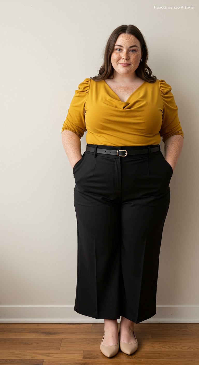 Exuding effortless professionalism, this ensemble expertly combines a rich mustard cowl neck top with tailored black wide-leg trousers. The top’s gathered sleeves add a subtle touch of sophistication, while the loose-fitting pants ensure comfort and a flattering silhouette for various body types. This outfit, cinched at the waist with a slim black belt, is ideal for smart casual office environments, business lunches, or sophisticated daytime events where refined style is paramount.